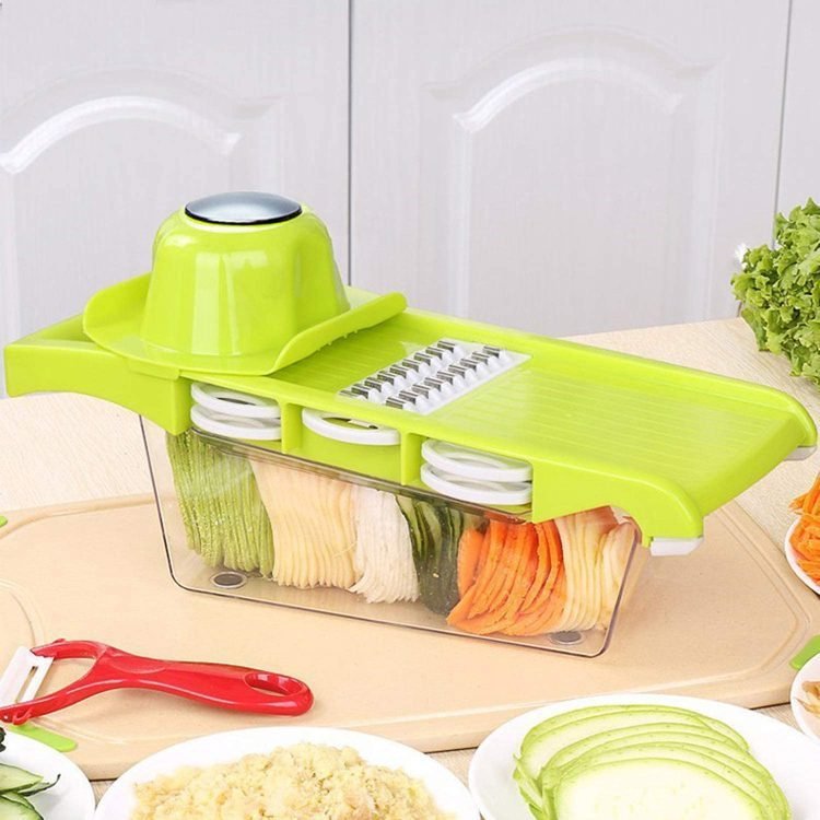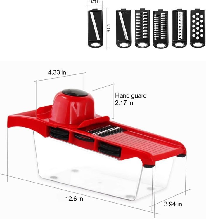 - Slicer comes with Interchangeable 6 blades, 1 food container base, 1 peeler and a finger guard. This vegetable cutter will make you save a lot of time.