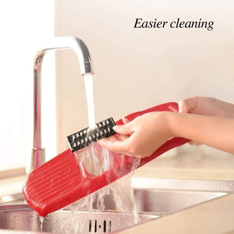 - SAFE AND STABVLE: A safe hand-guard holds your food securely and protects your hand from scratch. Our slicer comes with skid proof pads at the bottom of the panel and container to keep stability while slicing on a flat surface.