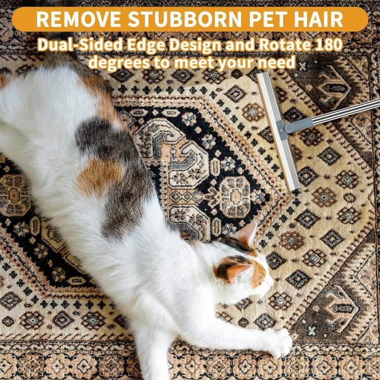 - ?Unique 180-Degree Rotating Design?: This carpet scraper ensures you to gather pet hair quickly into a pile from various directions, which can rotate 180 degrees, taking up minimal storage space.We provide you with a sturdy and seamless adhesive hook for you to hang the remover, which effectively solves the problem of clutter.