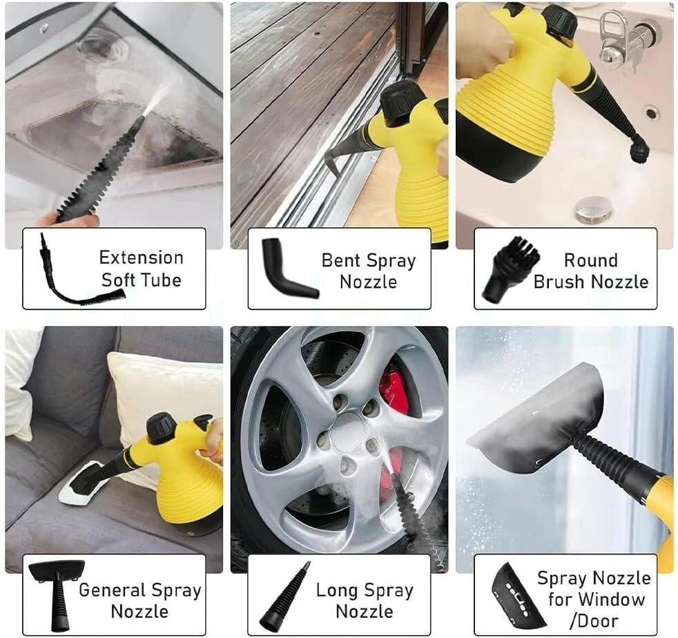High Pressure Steam Cleaner 350ml 1200W Power Multipurpose Portable Hand Cleaning with 9 Attachments Perfect for Removing Stains in Car Upholstery Home Kitchen Carpet Couch Multipurpose Steam Cleaner with Safety Lock 1200W Power is Best for Cleaning All Surfaces Remove Any Grease, Mold or Stains with Effortless High Pressure Steamer Designed to Clean Bathrooms, Toilets and Bathrooms Sput, glass and mirror, in to most other smooth surfaces. Perfect cleaning without chemicals Kills 99.99% of common household germs and provides up to 10 minutes of continuous steam cleaning Bring pure cleaning around the house with the steam cleaner. 350ml 1200W High Pressure Steam Cleaner Features: powerful hot steam: this steam cleaner runs at 1200W, heats water to 221°F (105°C) and provides up to 10 minutes of continuous steam. Thanks to its 350ml tank capacity and 2m long cord, it is ideal for indoor and outdoor use, easily removing grease and stubborn stains. VERSATILE ON MULTIPLE SURFACES Designed for use on a wide range of surfaces including ceramic, vinyl, hardwood floors, and moreSmooth surfaces clean beds, mattresses, duvet cover, sofa fabric and even clothes Removes wrinkles from shirts, pants and suits; Ideal for cleaning sinks, stoves, grills, upholstery, refrigerators, kitchens, windows, toilets, bathrooms, pet areas and car interiors. 9 ACCESSORIES INCLUDED: this powerful portable steam cleaner comes with a comprehensive 9-piece accessory set, featuring a straight nozzle, curved nozzle, extension hose, ironing brush, window squeegee, nylon brush, measuring cup, funnel, and cloth – everything you need for versatile cleaning tasks. Chemical Free & Safe: enjoy 100% chemical-free cleaning with no harmful fumes or residue. Equipped with a safety lock and safety lid, this steam cleaner ensures safe and environmentally friendly cleaning, making it a healthier choice for your home and family. Specifications of 350ml 1200W High Pressure Steam Cleaner: material: plastic. Special feature: multi-surface cleaning, chemical free, lightweight and portable. Total capacity of the tank:350ml, just put 280ml water max to leave some empty space to generate high pressure steam. Input Voltage:220-240V / 50-60Hz Power:1200W. Pressure:3.8bar Steam rate: 28g / min. Timing:10 minutes continuous. Color:Multi Country of Origin:Made in China Package included:1*Straight Nozzle, 1*Curved Nozzle, 1*Extension Hose, 1*Ironing Brush, 1*Window Squeegee, 1*Nylon Brush, 1*Measuring Cup, 1*Funnel, 1*Cloth.