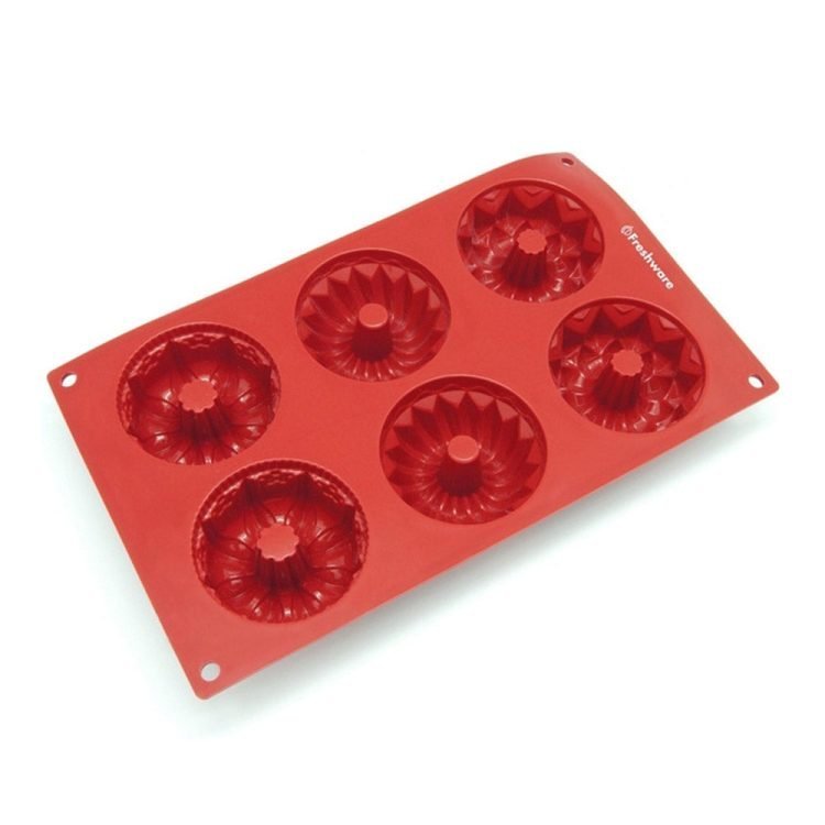 Make beautiful mini bundt cakes with Freshware. This Chef’s Specialties nonstick silicone baking pan makes six perfectly-shaped bundt cakes without creating a mess. Color: May varyMaterials: Silicone Flexible and nonstick pan pops goods out with easeStain and odor resistantPromotes even browning and cookingMicrowave, oven, freezer and dishwasher safeTemperature-safe range from -40-degrees F to 446-degrees F Pan size: 11.7 inches long x 6.8 inches wide x 1.6 inches highCup size: 3 inches in diameter x 1.6 inches high Volume: 6 x 80 ml per cup, total 480 ml