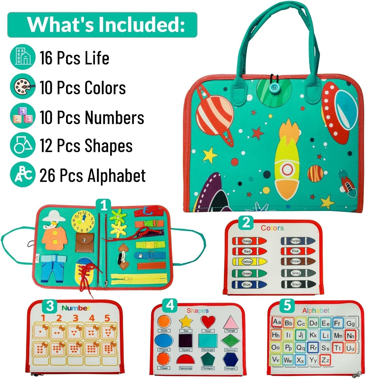 - Introducing our latest 12-page Toddler busy board Designed for ages 2-4, it offers a variety of engaging activities including fine motor skill practice, preschool learning, and imaginative play with outer space elements. Includes a zip pocket for tidy storage.