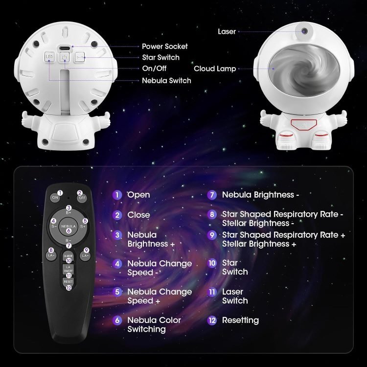 - The projection effect of the astronaut projector is very beautiful, creates a vivid starry sky with this projection films. Its head can be adjusted at 90 degrees and its arms can be adjusted at 360 degrees at will.