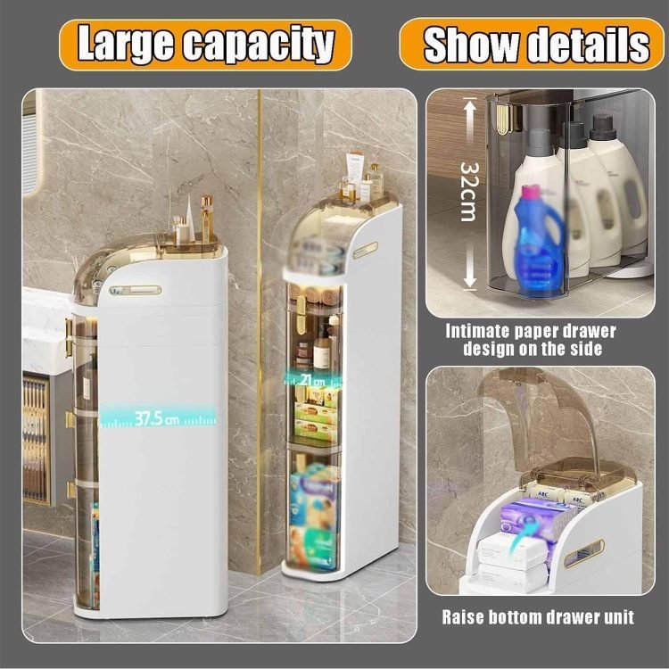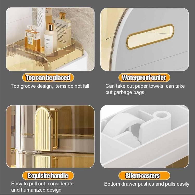 - ?Large Storage Space?This freestanding bathroom toilet paper cabinet has plenty of space to store items. Open top cover and recess for tissues and dental cups. Drawers of different heights can hold bath towels, towels, cosmetics and skin care products. The bottom is raised. the drawer can be specially placed for medium and large items such as laundry and s