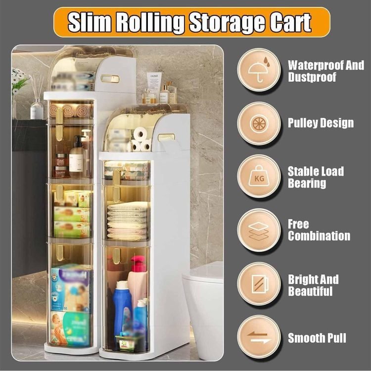 - ?Removable Slim Storage Drawer?The narrow bathroom floor cabinet adopts four raised legs, 2 of which have rollers, which can be easily pulled out and pushed back, the freestanding rolling organizer is strong enough to support items heavy