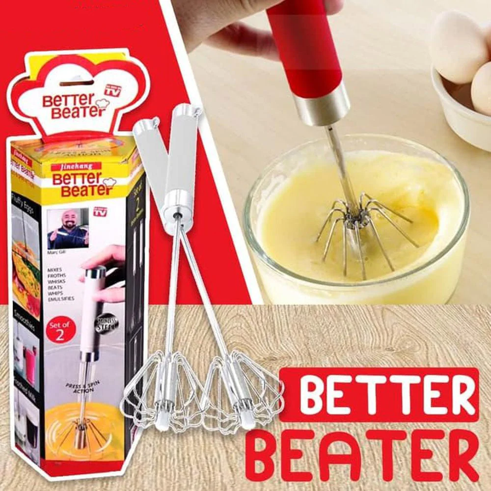 Better Beater Manual Hand Mixer Push Rotation set of 2 Product details of Better Beater Egg Whisk Press & Spin (2-in-1) Push action rotation whisk Performs 10 times better than the manual whisk Dishwasher safe.