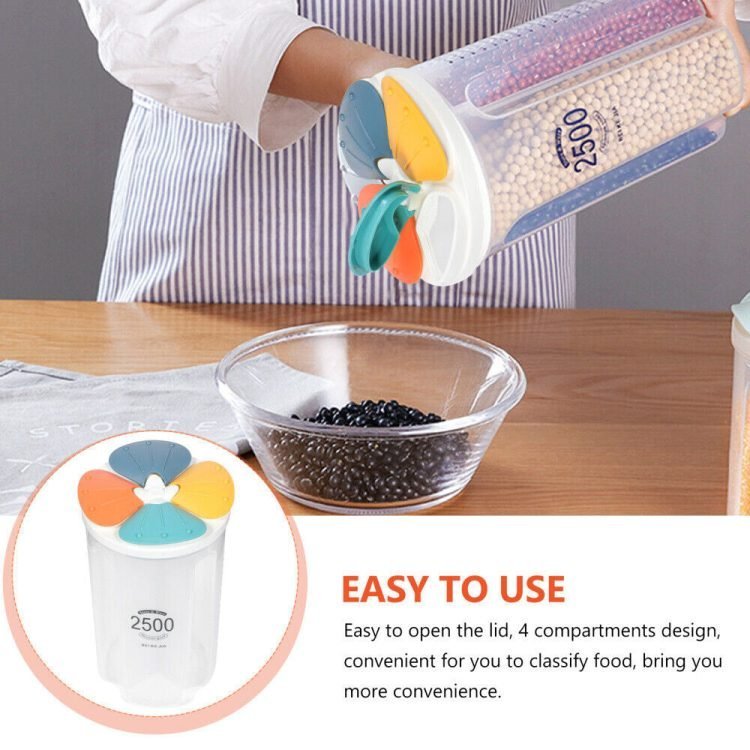 Division Design: this cereal dispenser is with 4 compartments which work as dividers sorting, multi purpose and practical. The inner partition board can be removed. Precise measurement gradations on measuring and portioning easy.