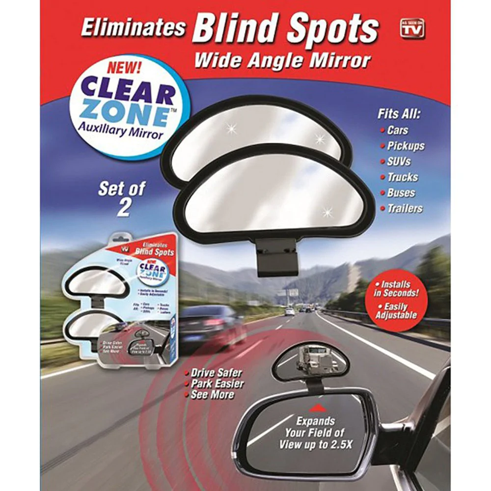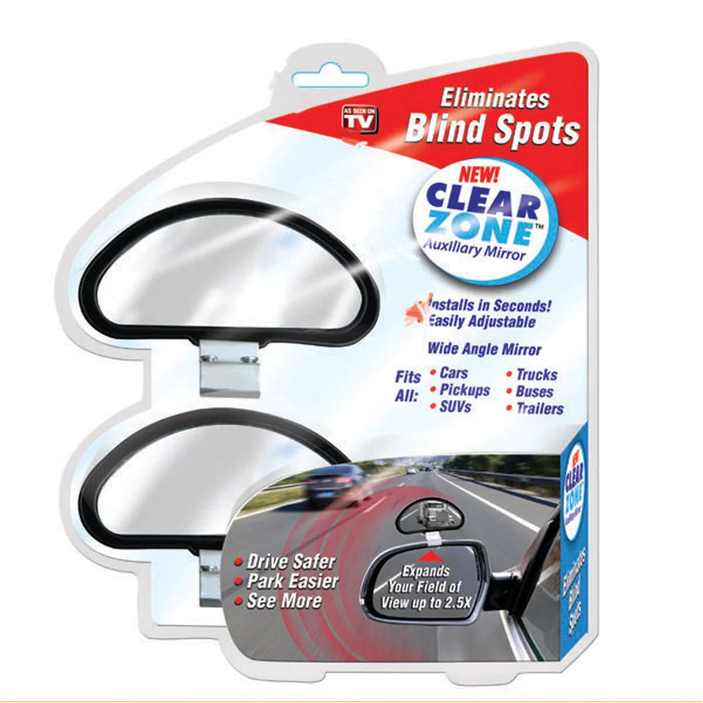 The Clear Zone Auxiliary Mirror is the fully adjustable wide-angle mirror that virtually eliminates blind spots.Standard factory side-view mirrors have a limited field of view that create dangerous blind spot, but Clear Zone’s unique wide angle convex design instantly widens your field of view to three lanes of traffic and clearly reveals vehicles hidden in your blind spots.Installs quickly on your existing mirror – no tools needed. Adjustable for a customized view.The Clear Zone help you drive safer, park easier and see more.Measures 4.5″x1.75″x3″