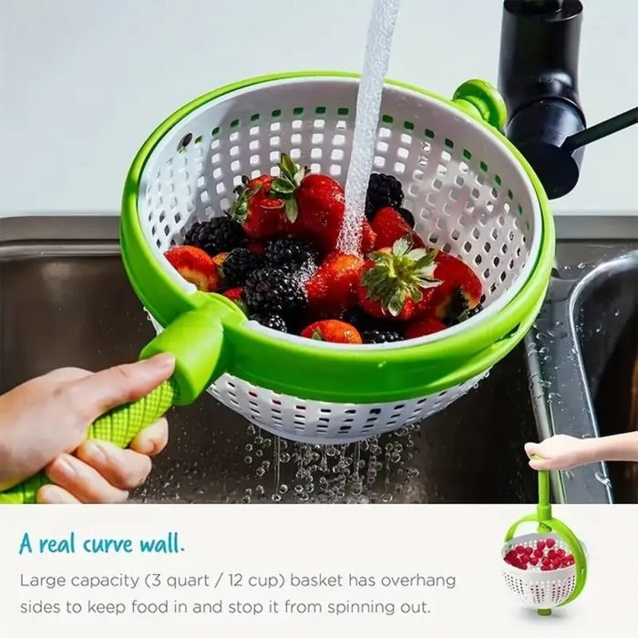 This rotating fruit and vegetable dryer features a long handle for easy use, making it perfect for preparing salads, vegetables, fruits, pasta, rice, and more. Made from food-safe plastic, it ensures your food remains clean and safe. Its collapsible design makes storage convenient and saves space
