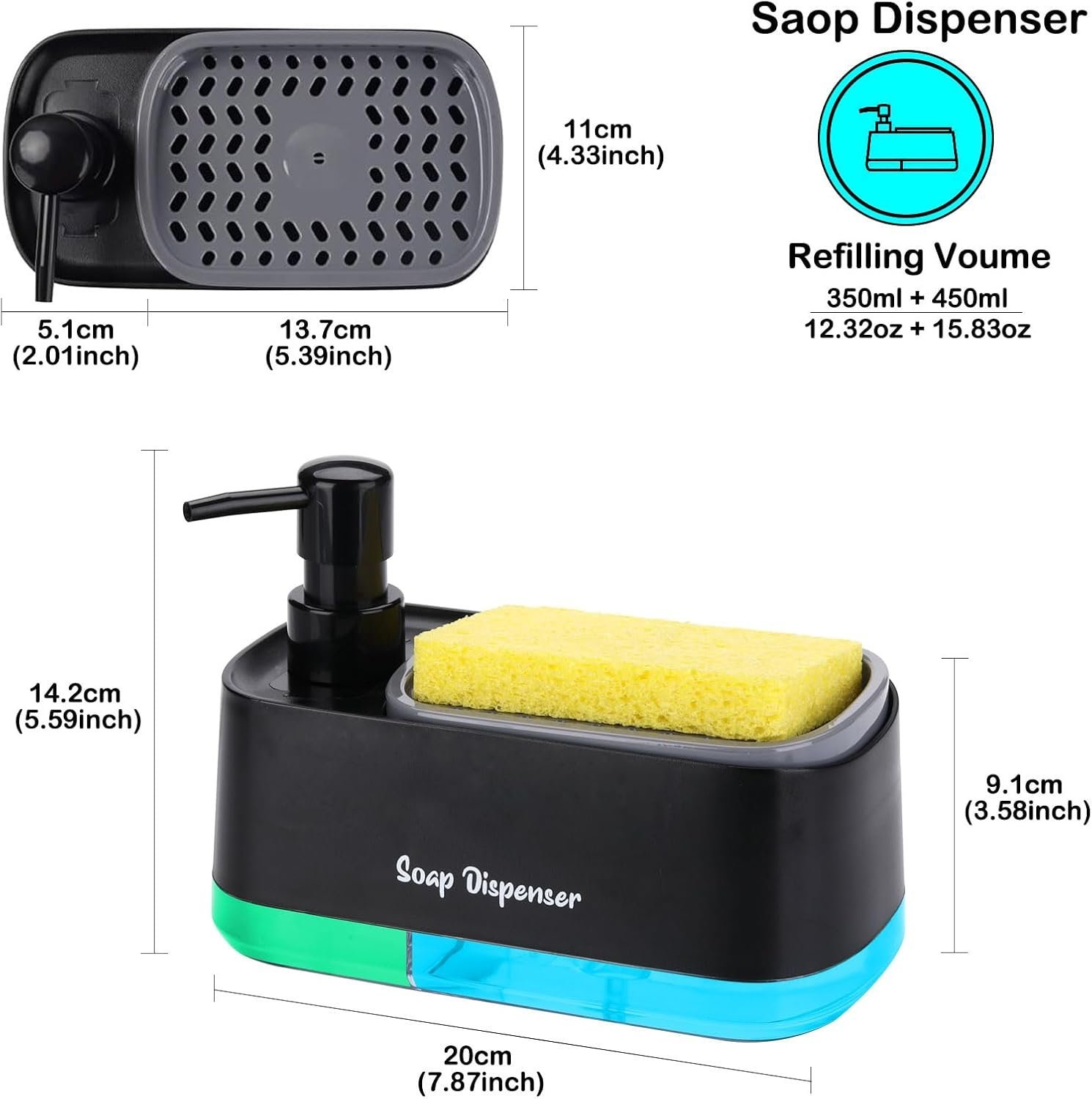 • – 3-in-1 Functionality: Designed with a pump head, sponge holder, and two separate containers for dish soap and hand soap, this dish soap dispenser streamlines and simplifies your cleaning process with efficiency and organization. No more cluttered countertops or searching for soap!