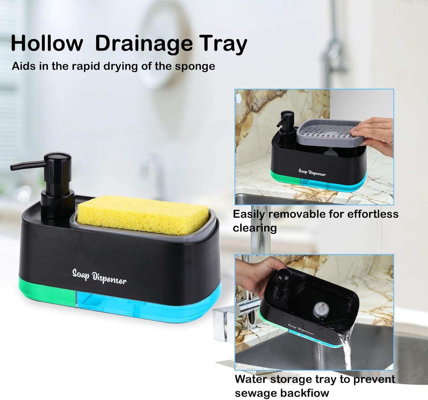 • – Drainage Holes Design: Our hand and dish soap dispenser set features a unique sponge holder with a built-in drainage system. Any excess water will drain out through the holes, preventing water build-up and ensuring a dry and clean countertop. Cleaning up is a breeze, too – simply remove the sponge holder and pour out the excess water.
