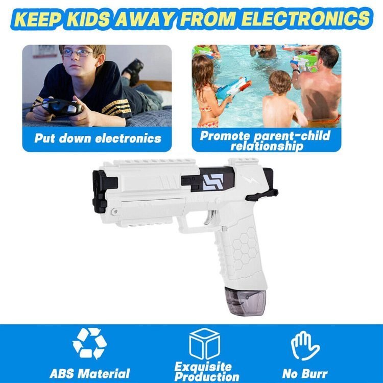 Made of safe and non-toxic ABS material. Comfortable to grip. Adopts an airtight water tank that prevents water leakage and is extremely durable. This automatic water gun can be played by both adults and children