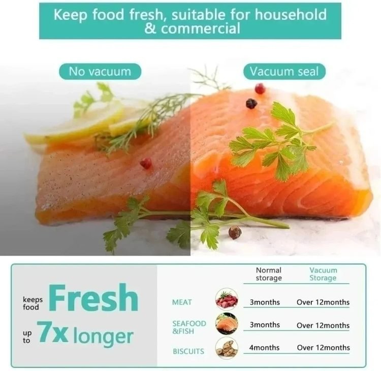 2.Vacuum Sealing to Keep the Food Not Rotten: The food sealing machine generates high suction, and all the air in the bag is extracted to ensure that the freshness of the food is prolonged by 8 times. Seals them to keep fruits, meat, sweets and vegetables not rotten and extend their shelf life.