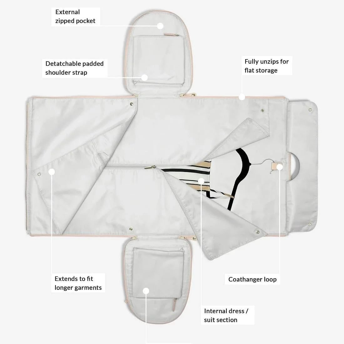- High-Quality Nylon Material:?Made from premium nylon, this garment bag is durable, water-resistant, and built to withstand the rigors of travel. Its tough construction ensures long-lasting use while maintaining a sleek and professional appearance. Available in classic black or chic beige, it complements any travel wardrobe.