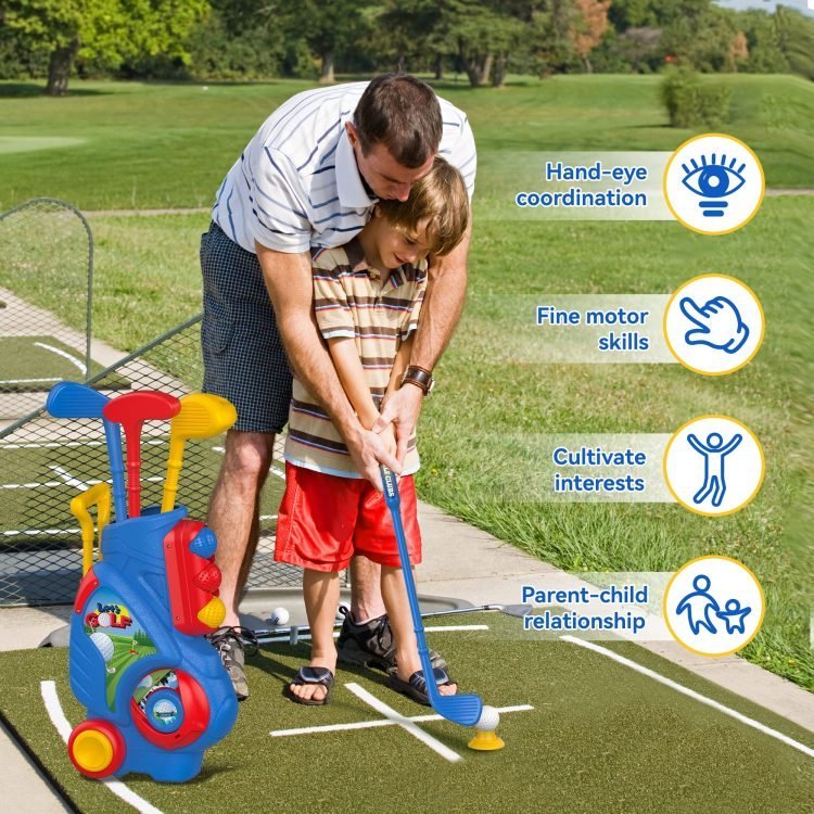 The baby golf set includes 1 golf cart, 3 golf clubs (putter, iron, and wood, putter and iron are left-handed compatible), 2 holes, 2 flags, 2 golf tees, and 6 balls (3 white and 3 colorful). The toy golf set is a great way for children to learn about the interesting sport of golf.