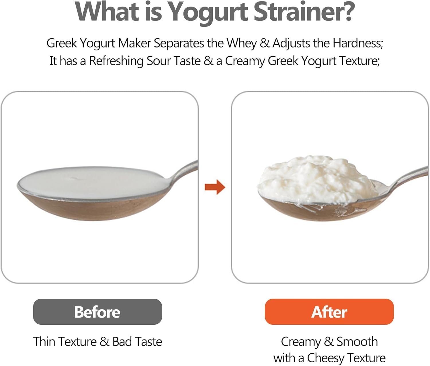- ✔️ LARGE CAPACITY This yogurt strainer holds up to 33 ounces of yogurt, enough to make delicious cheese or Greek yogurt for the whole family. It features a high capacity and compact design for more thorough whey filtration. When the excess water is removed, the yogurt passed is milder and gives it a delicious, cheese-like yogurt flavor.