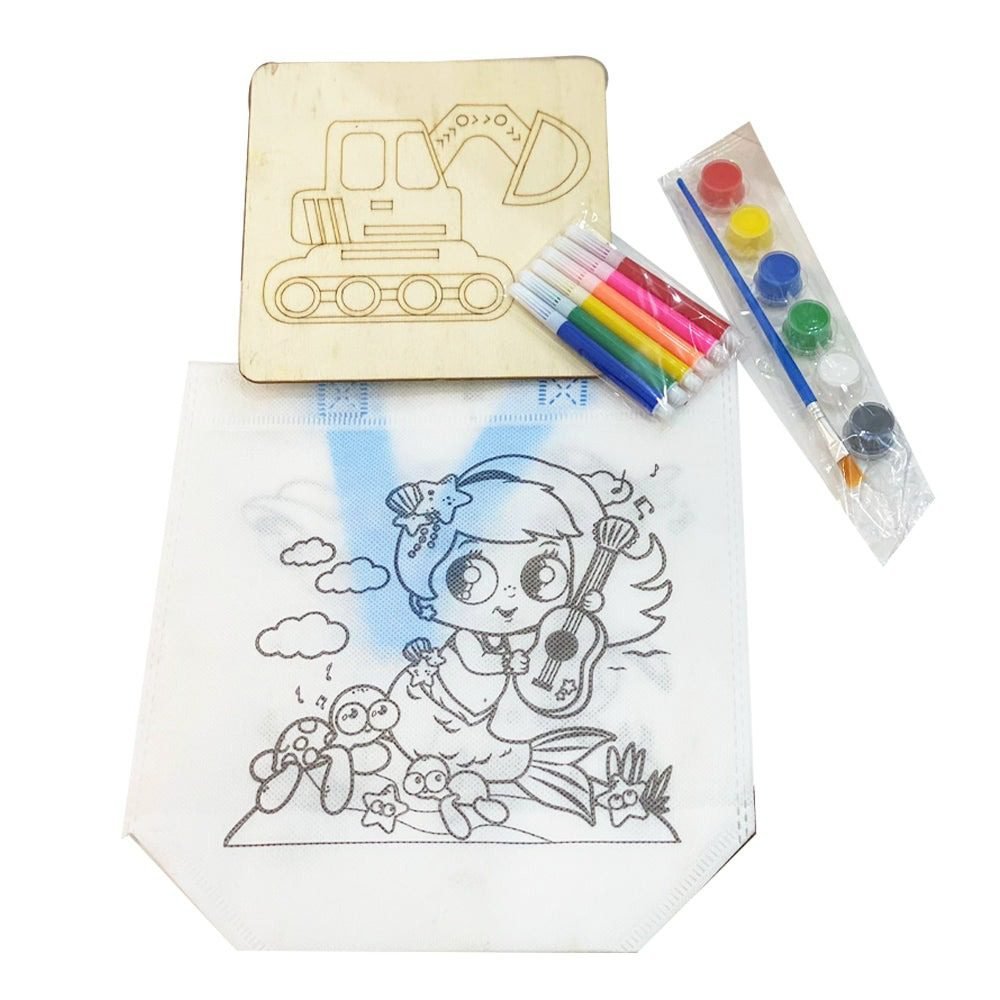package includes: 1 canvas , 1 wooden craft , 6 water color , 6coloring pen