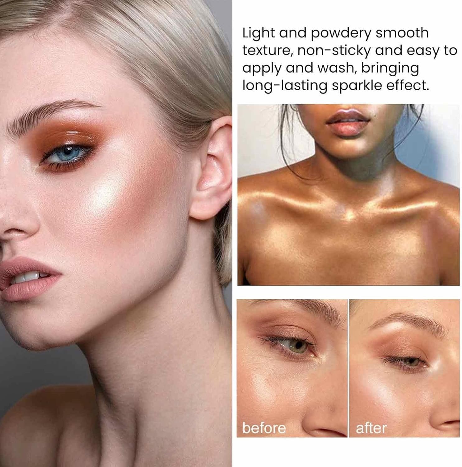 - The highlighter powder has fine texture, light texture, easy to apply, and will not feel heavy on the skin. It can maintain the light feeling for 24 hours, making your makeup more charming.