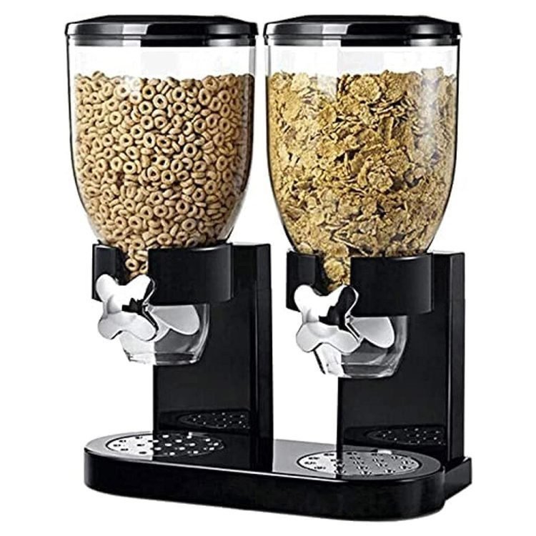- Double cereal dispenser, each plastic container holds up to 17.5 ounces