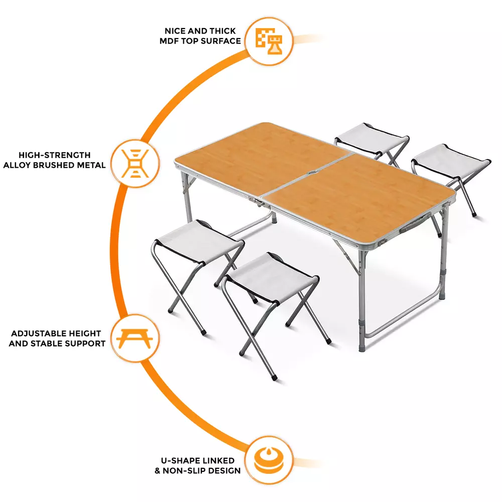 Introducing the newly designed high-quality kitchen dining set, ideal for outdoor and indoor use. This folding, portable picnic and camping table comes with 4 stools, making it perfect for a wide range of activities such as camping, picnics, BBQs, car boot sales, buffets, playgroups, parties, and more.