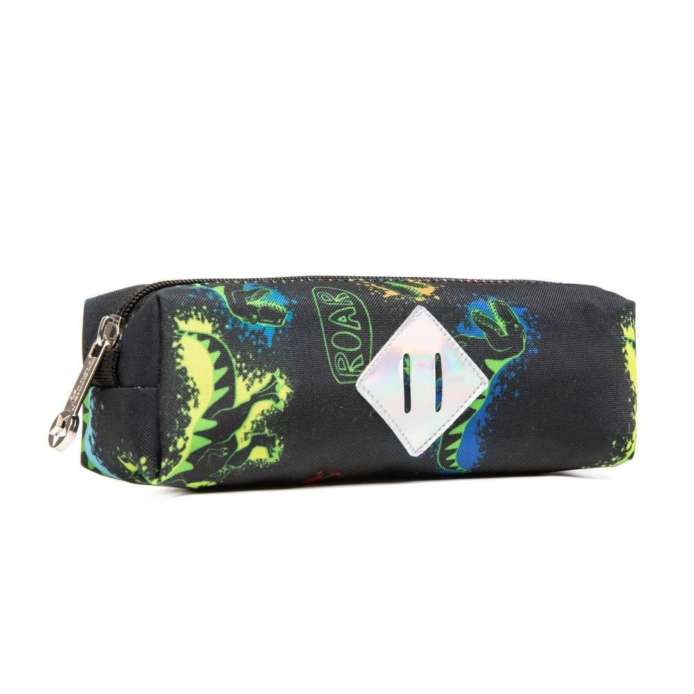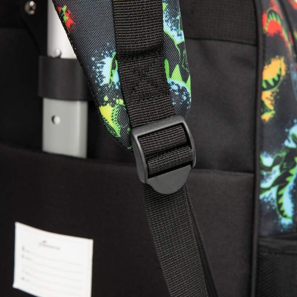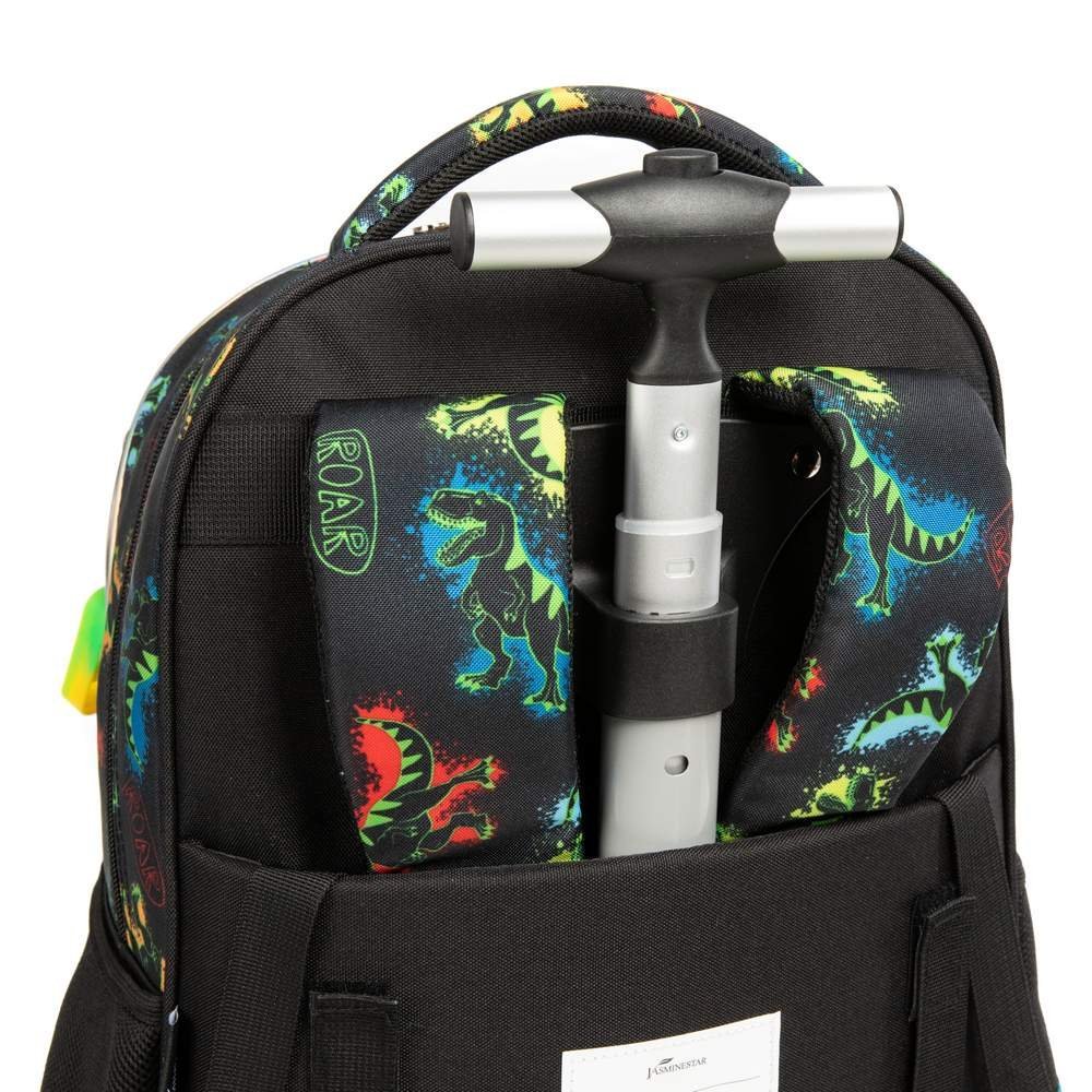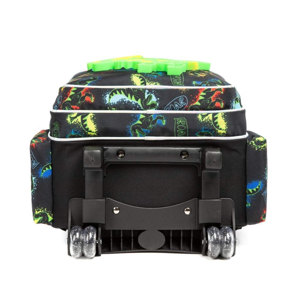 - This kids rolling backpack for boys has a green toy dinosaur printed on the front pocket, along with a small charm that adds a childlike touch to the whole bag. And the whole picture of the school bag is composed of dinosaurs from the same series.