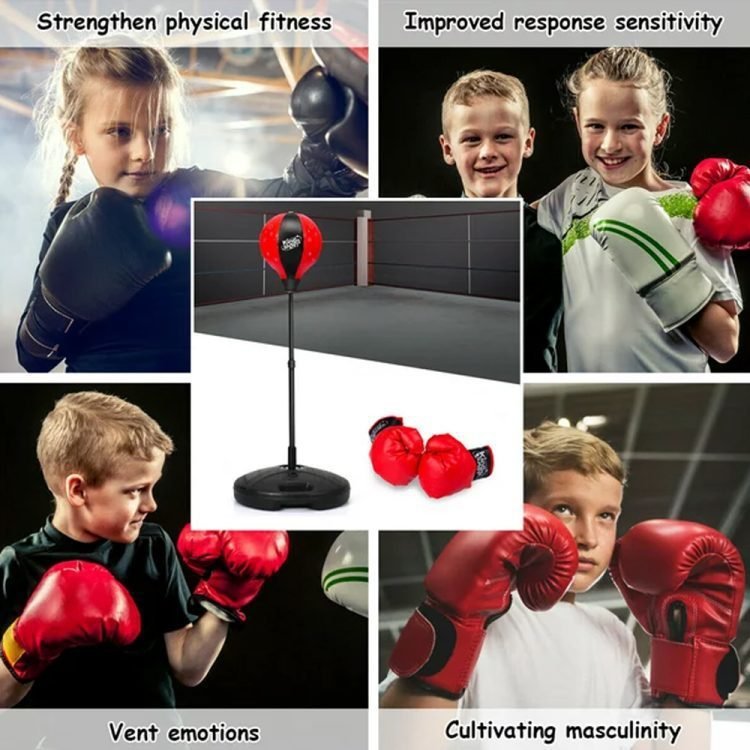 The spring-action standing punching bag can be adjusted to best suit your child’s height. Boxing gloves filled with soft upholstery provides more safety for children.