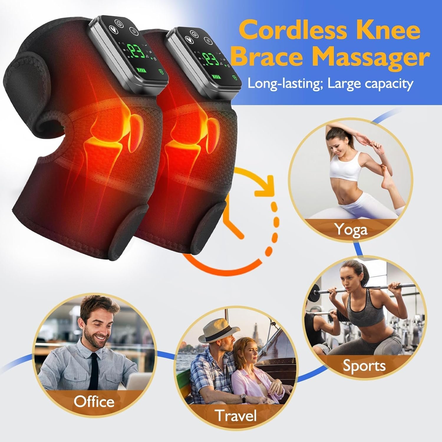 • Cordless Massager: Our cordless knee heating pad is portable and people can move around when using it without being bothered by wires. The battery capacity of 5000 mAh can be used in many scenarios and is very suitable for all ages.
