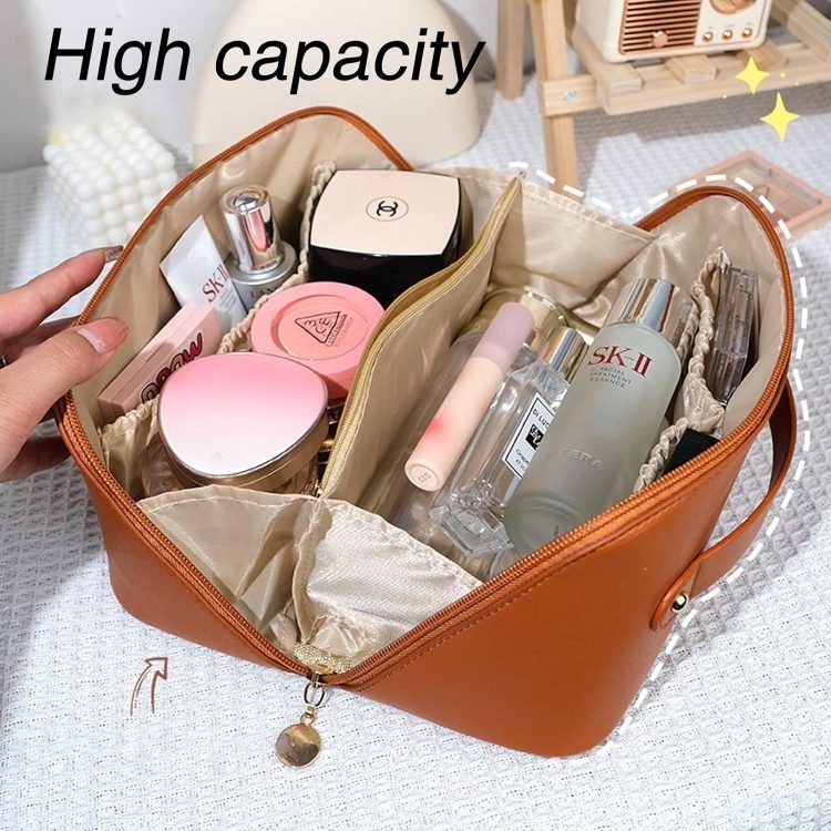 Large Capacity Travel Cosmetic Bag,Multifunctional Makeup Storage Bag with Handle,Waterproof Portable PU Leather Make Up Bag for Women Girls, brown, Travel Cosmetic Bag