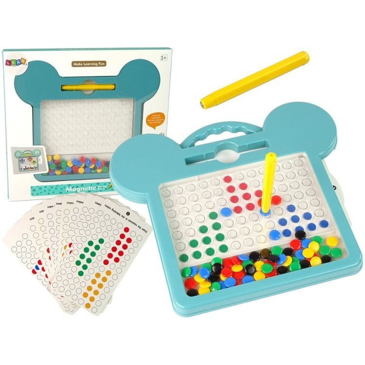 Magnetic beads are placed under the surface of the screen, using the stylus try to catch one of the beads and move it to the right place on the board according to the pattern. There are cards included that show a task of sorts, simply arrange the magnets by colour and pattern. Under no circumstances should classic pens, markers or ink pens be used on the screen.