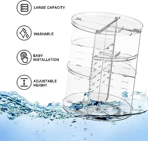 • ? [ADJUSTABLE 8 LAYERS]—4 middle trays can be adjusted to any layer of 8 in order to accommodate all your bathroom items in different size and height. 360 revolving design helps easily place and access all what you need in seconds.