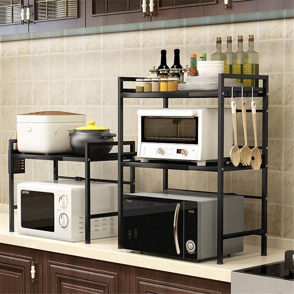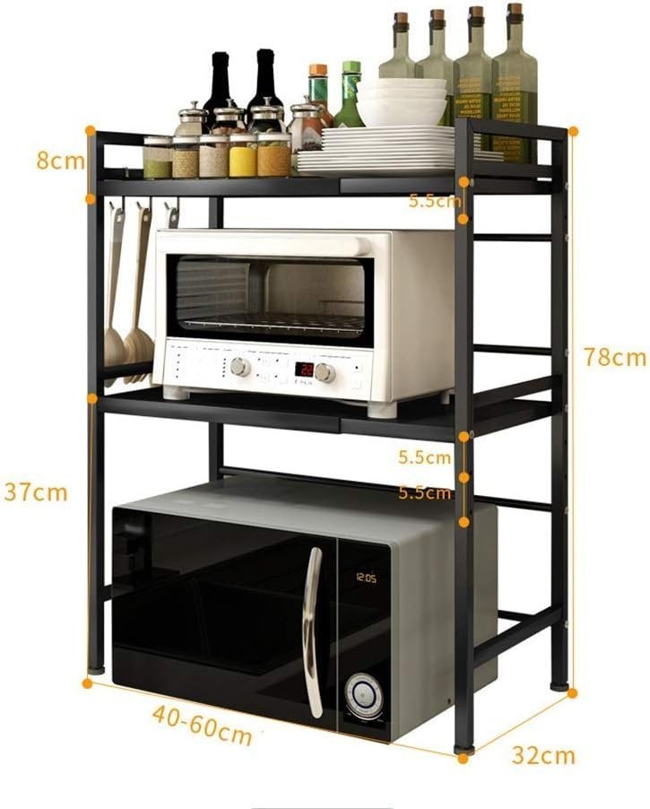 Microwave Stand Kitchen Shelves Microwave Rack Floor Retractable Adjustable Three- Layer Oven Rice Cooker Kitchen Storage Rack Microwave Storage Cart (Color: Black, Size: 40 x 32 x 78cm)