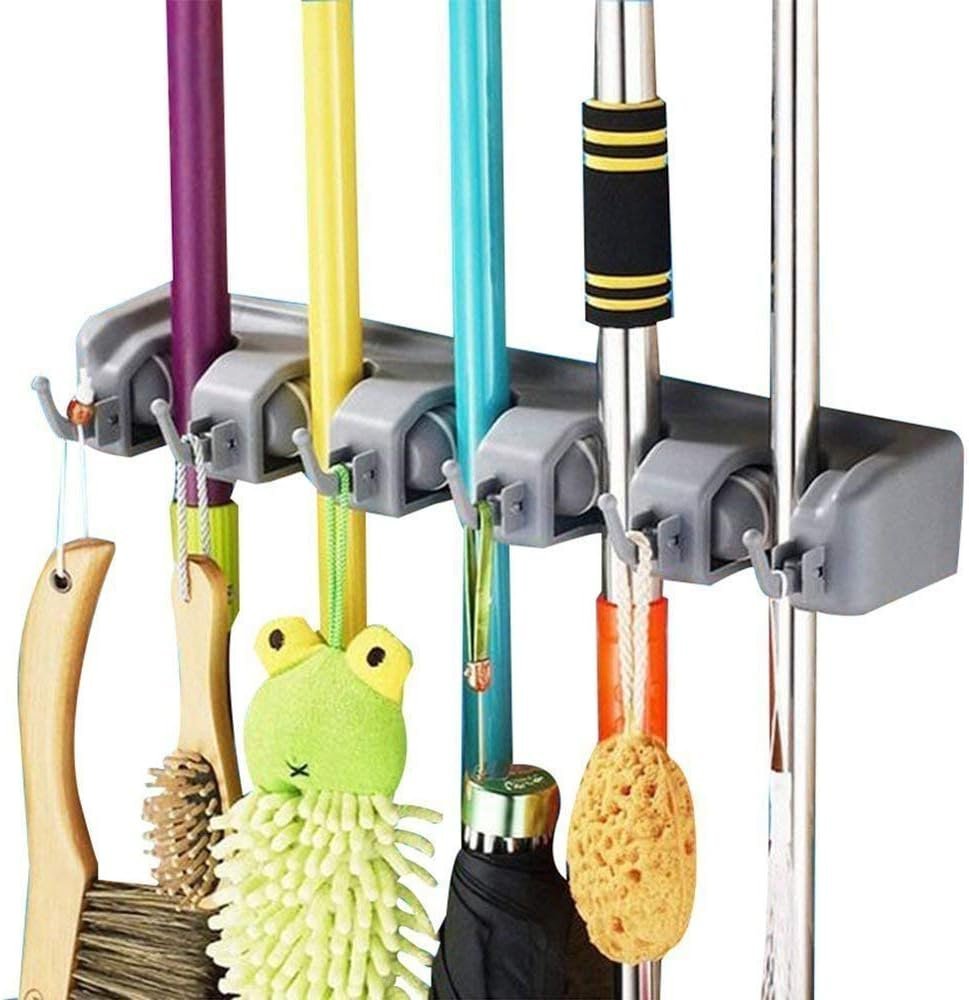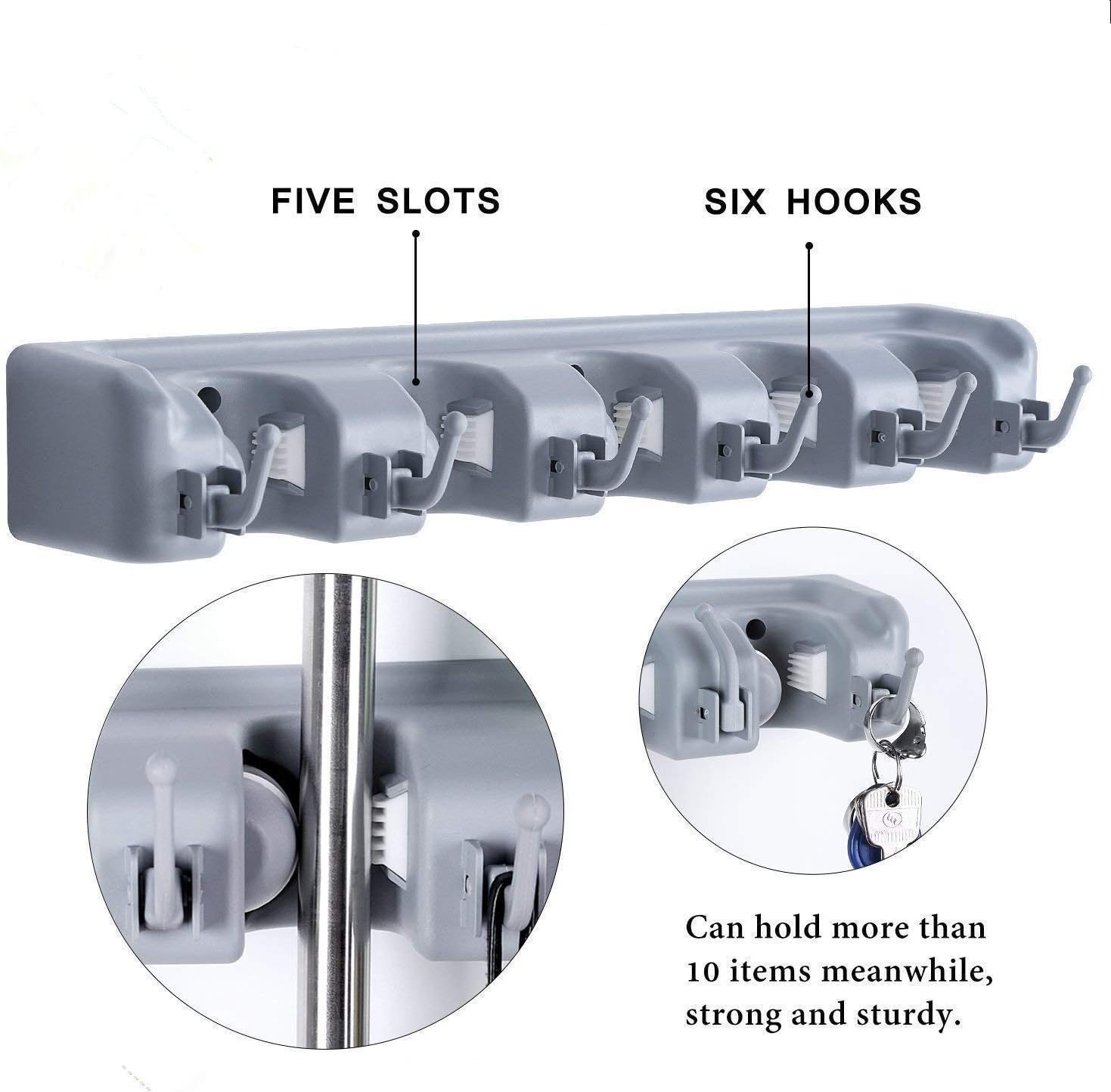 Mop and Broom Holder, Multipurpose Wall Mounted Heavy Duty Tool Organizer Storage Hooks,Ideal Broom Hanger for Kitchen Garden and Garage laundry room,5 Position with 6 Hooks