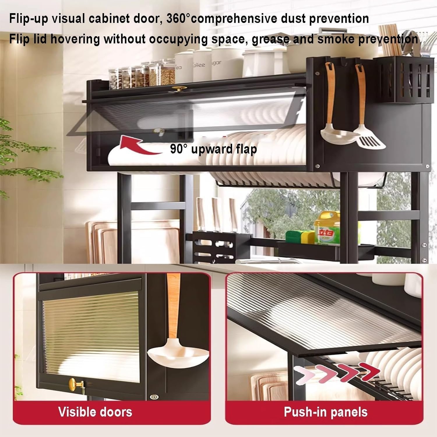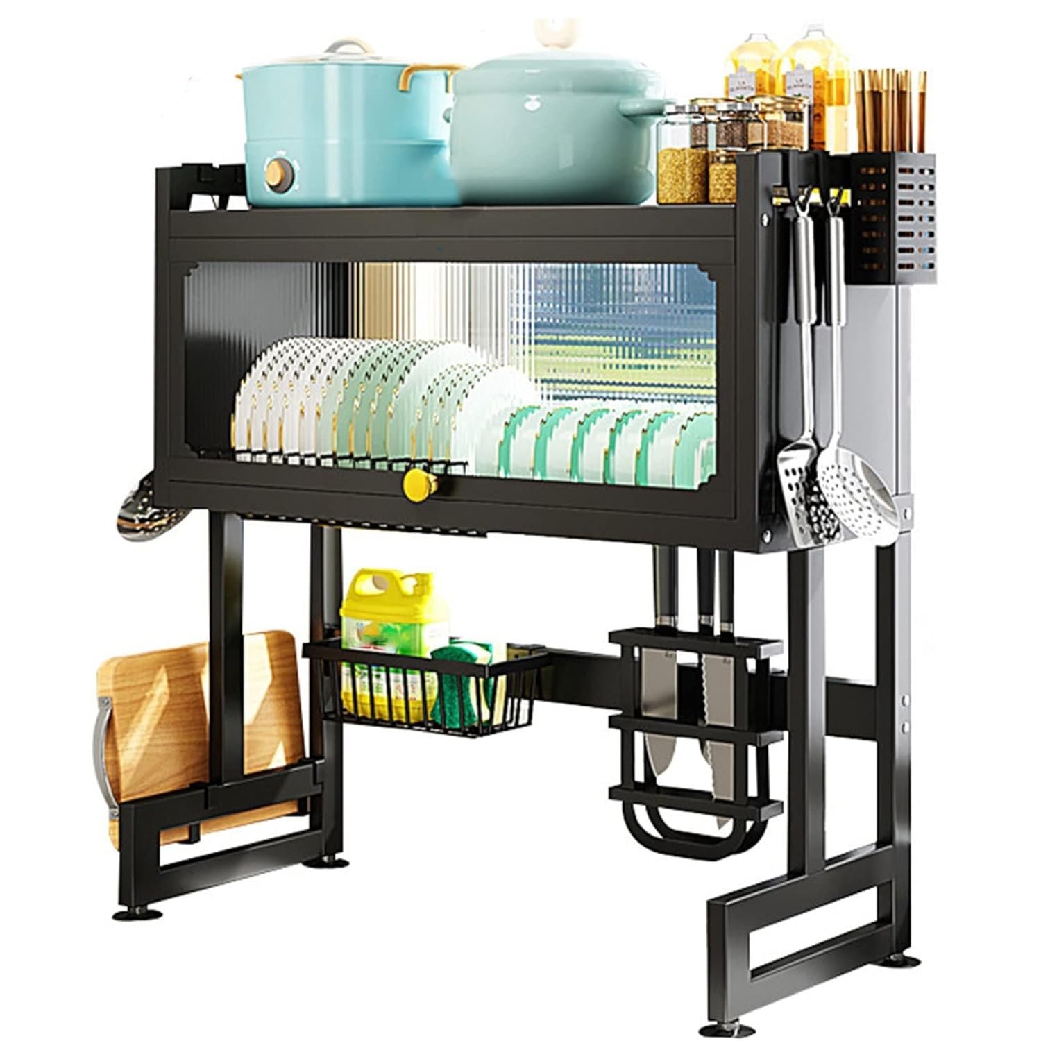 - ► DOUBLE LAYER STORAGE DESIGN The cutlery holder over the sink is sturdy enough. Large capacity can accommodate all the dishes without taking up space. The design above the sink allows the water to drain directly into the sink and not to the countertop, effectively avoiding water accumulation.