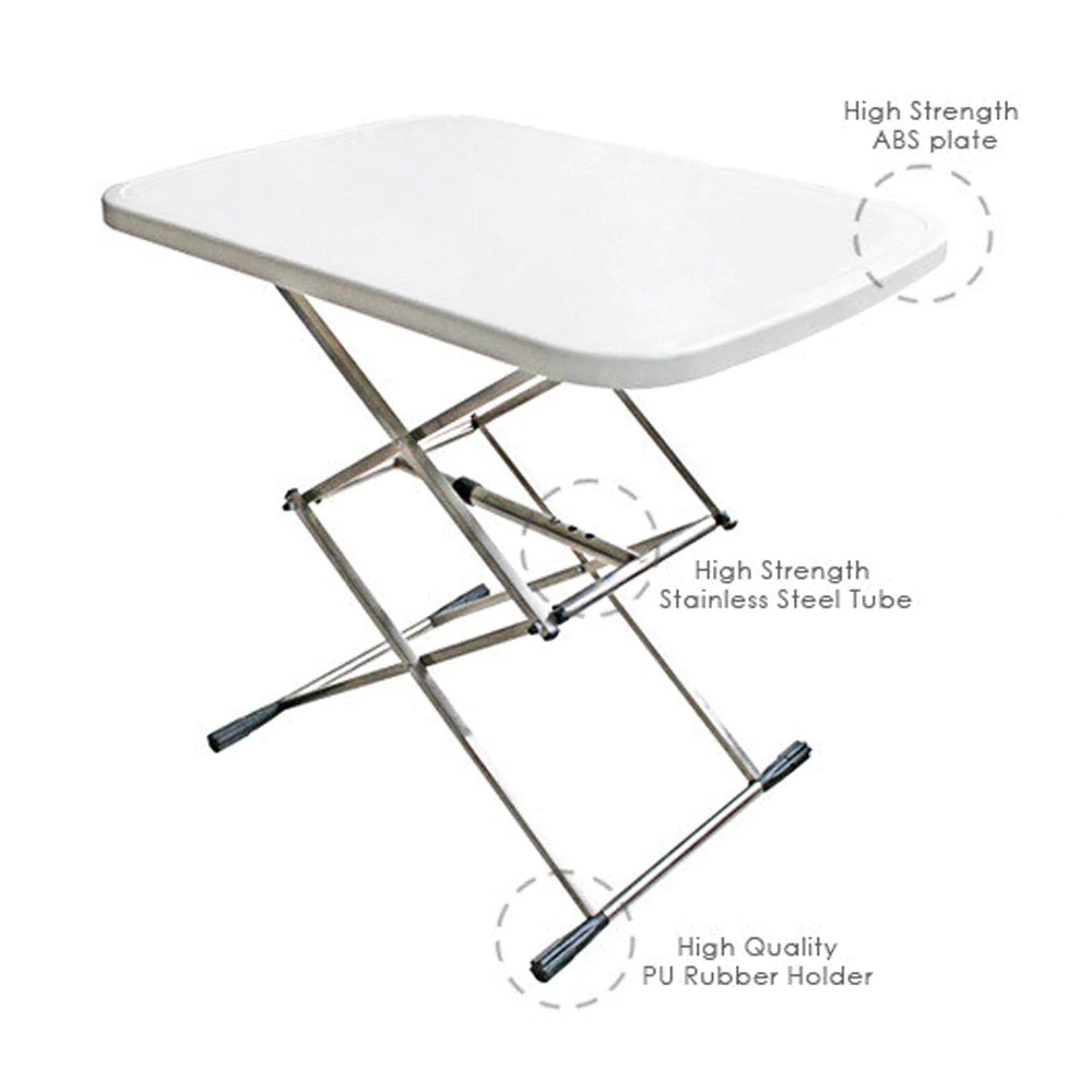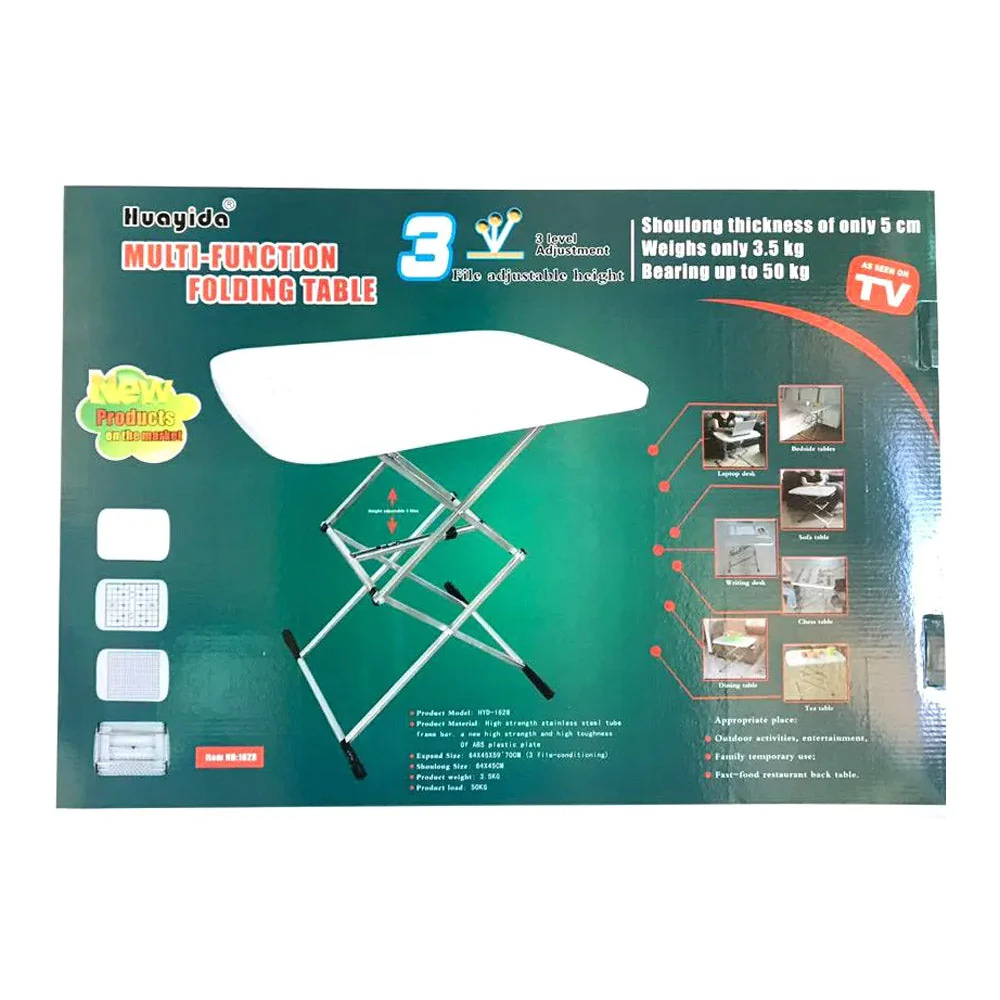 Multi Function Folding TableProduct details of Multi-Function Table Adjustable Folding TableLight weight, Portable, Easy to move.Foldable & AdjustableDurable construction quality, 5cm thickness topHigh strength stainless steel frameHigh strength toughness ABS plateEasy to clean or maintainIdeal for indoor or outdoor useFold away for easy storagePerfect for: Office, home, outdoor activities, entertainment, dining table, sofa table, tea table, writing desk, laptop desk3 level adjustable height.