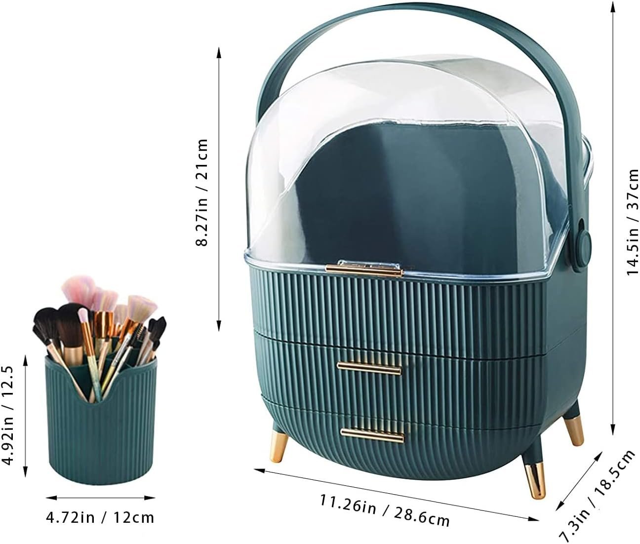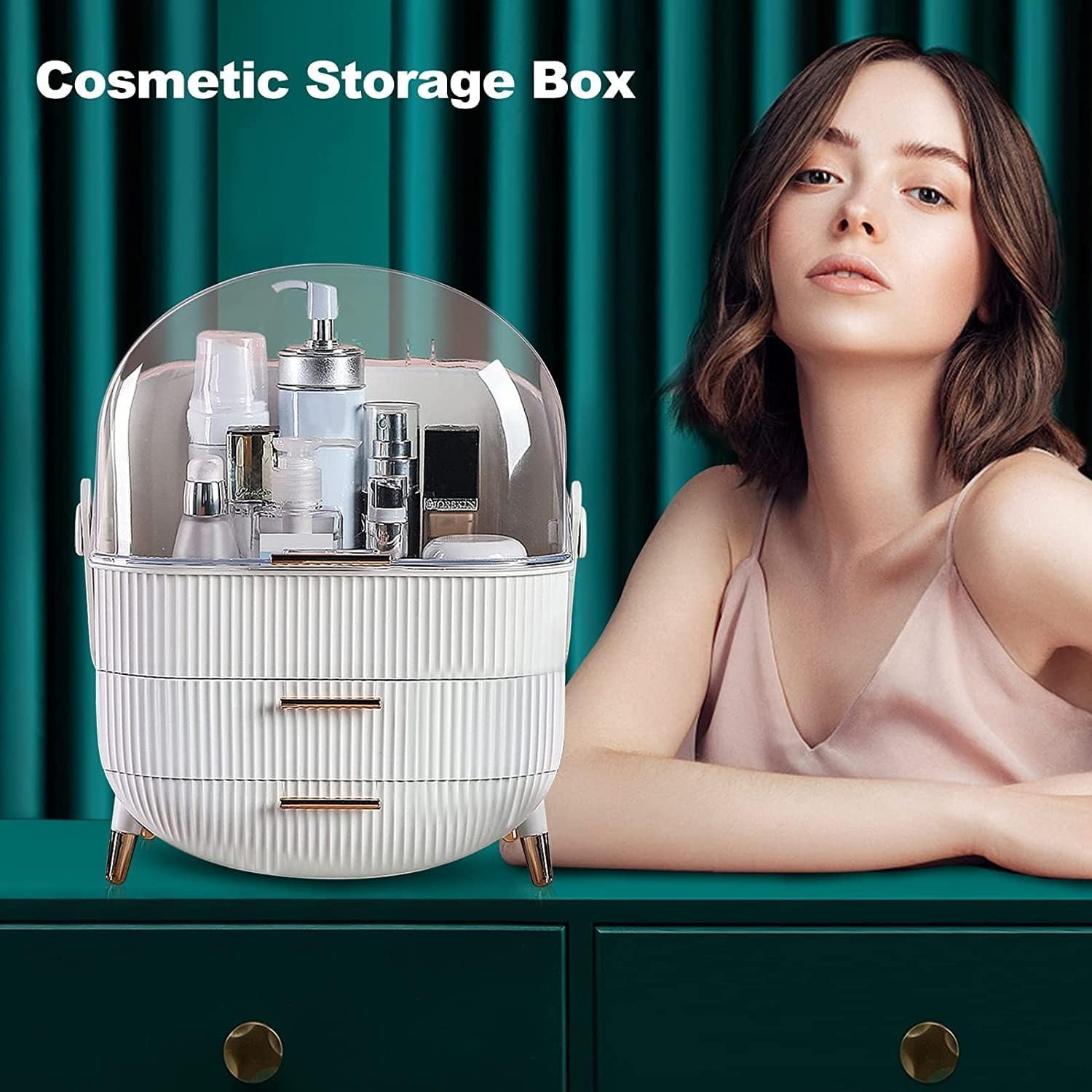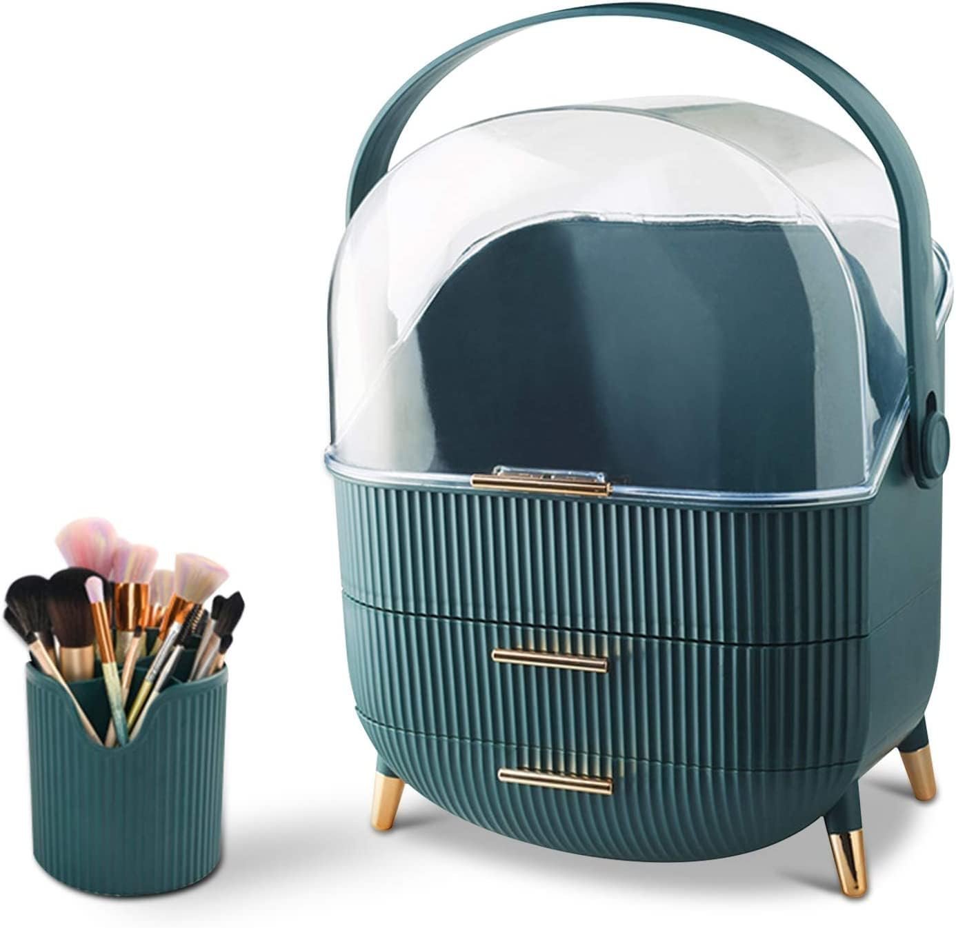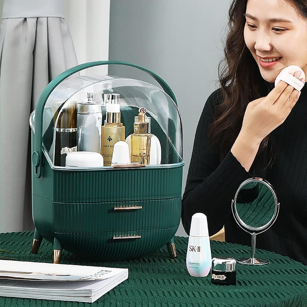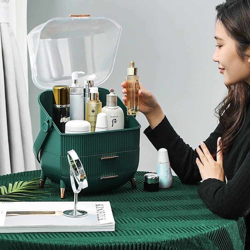 - The makeup organizer box with cover stores your cosmetic items of different shapes and sizes while keeping them well organized. Decorated with clear lid and drawers, protecting your cosmetics away from dust and water, The lower two-tier storage drawers could dividedly store lipsticks, lip gels, makeup brushes, eyebrow pencils, foundation sticks, beauty gadgets, necklaces, rings, and more.