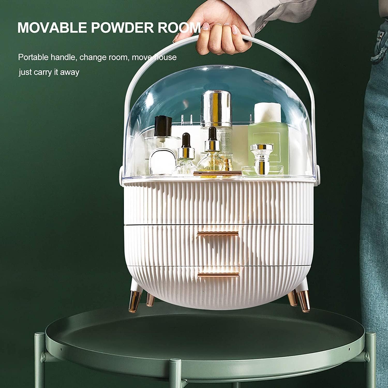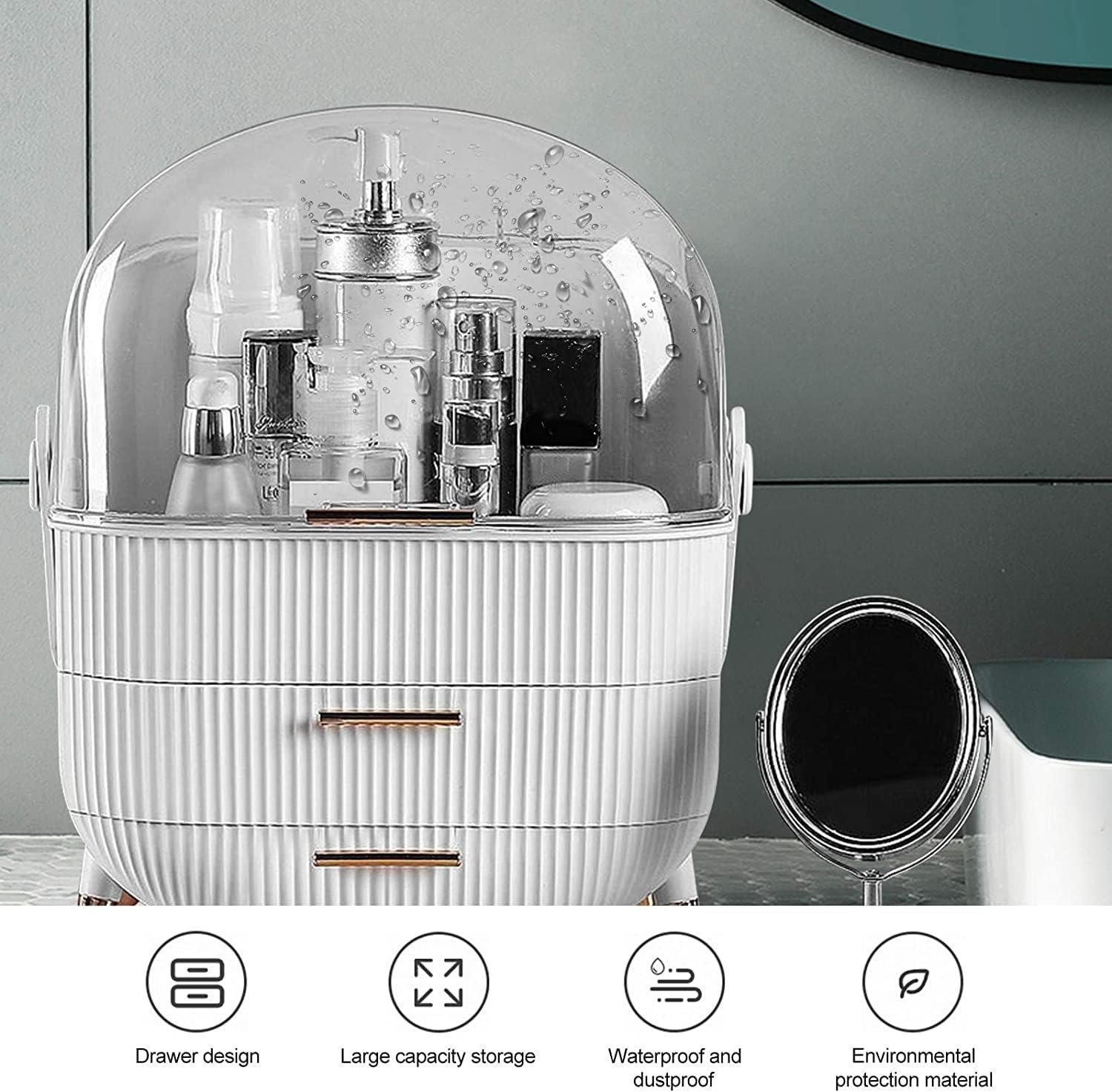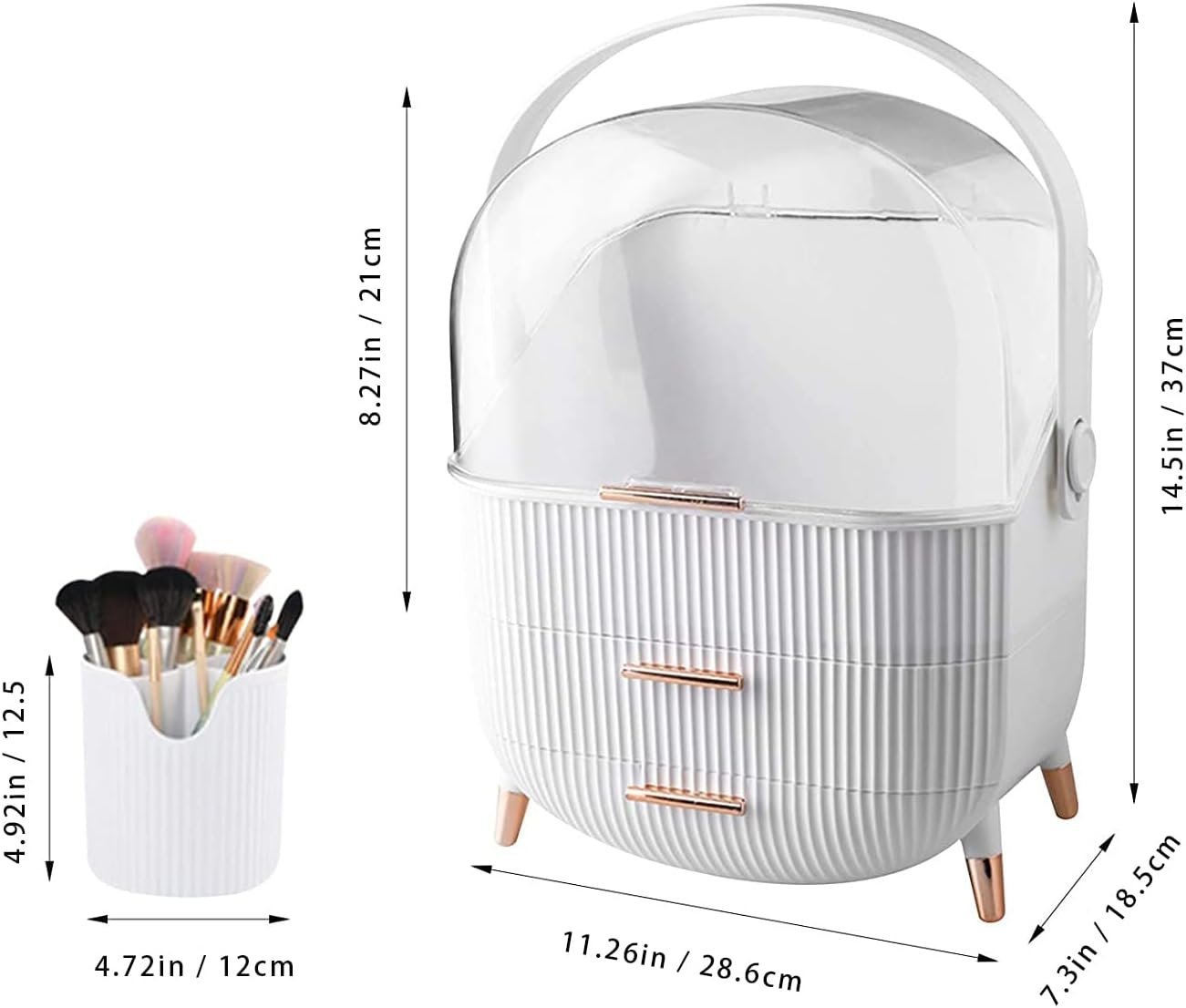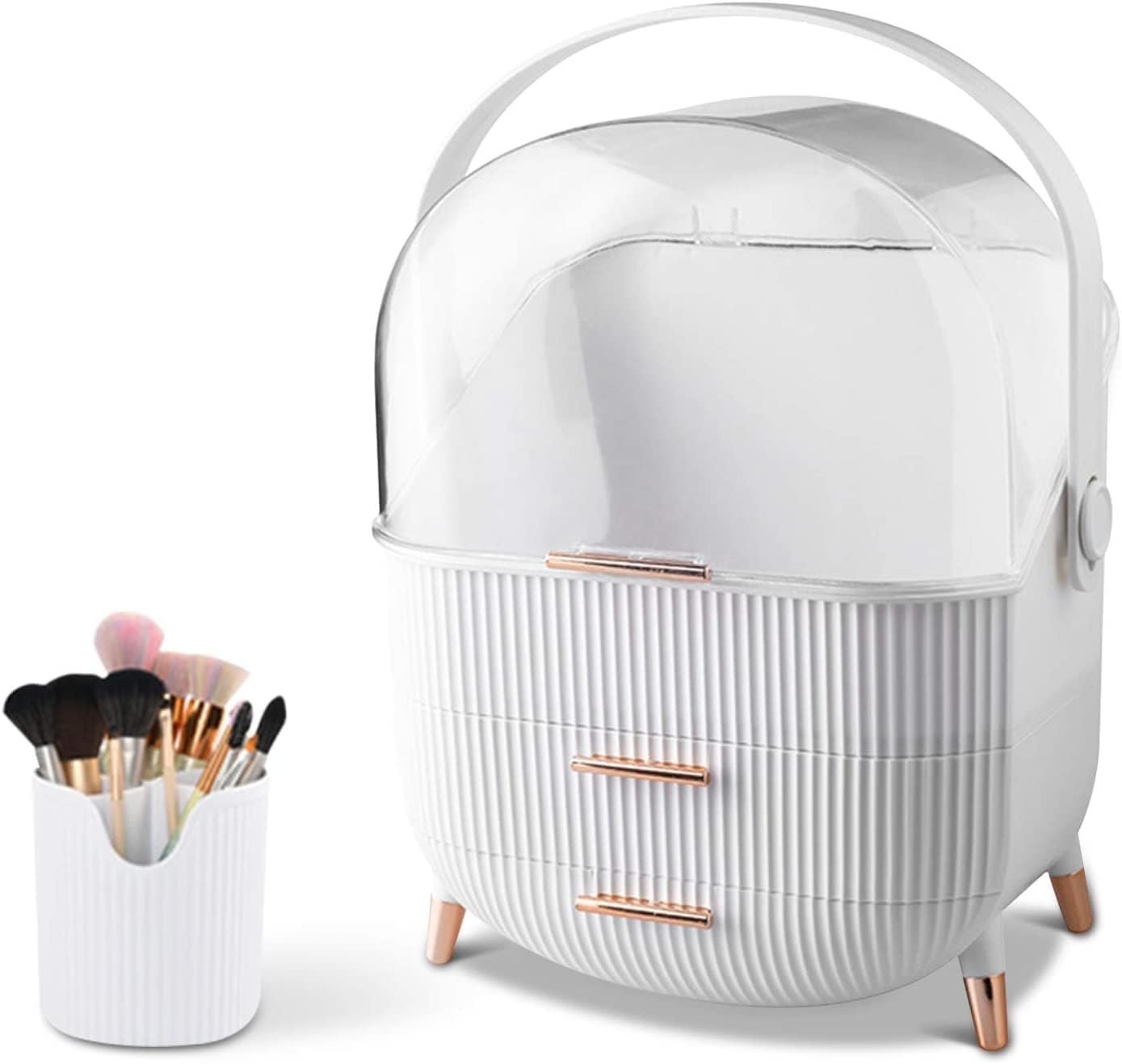 - The makeup organizer box with cover stores your cosmetic items of different shapes and sizes while keeping them well organized. Decorated with clear lid and drawers, protecting your cosmetics away from dust and water, The lower two-tier storage drawers could dividedly store lipsticks, lip gels, makeup brushes, eyebrow pencils, foundation sticks, beauty gadgets, necklaces, rings, and more.