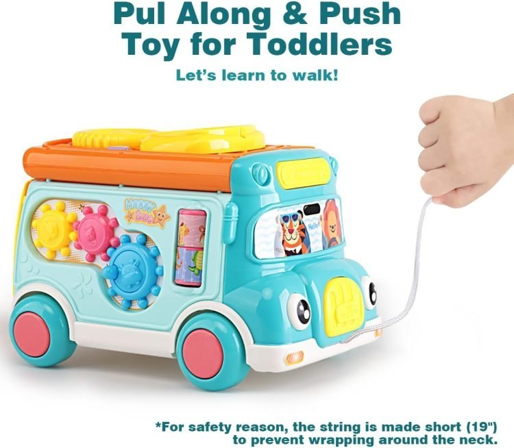 - This bus’s handle and wheels make it perfect for your baby to use it as a walking and dragging toy. It also has a door that encourages your baby to develop storage habits and promotes exercise and development.