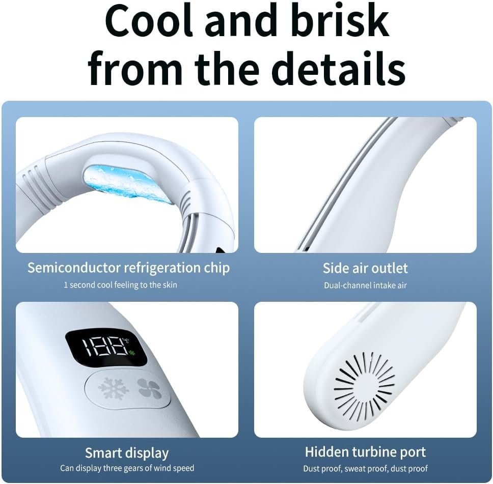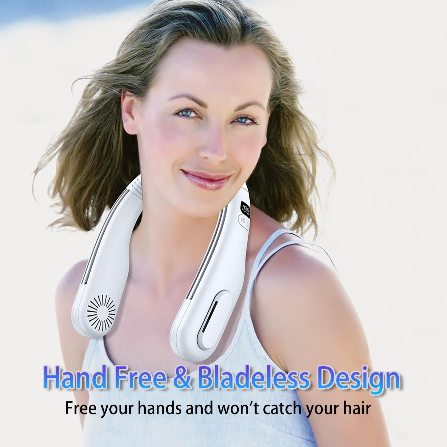 - 【Bladeless Neck Fans & 360° Surround Air Flow】 Ergonomic design, in addition to excellent cooling functions, it is equipped with a double turbine fan that rotates at high speed. With a 360° surround blower neck fan. The neck fan adopts a turbine air collection, equipped with a cooling plate equipped with a cutting-edge Peltier element. Blows air in three dimensions, will not ruin your makeup and can be used safely. Bladeless design doesn’t get caught in your hair.