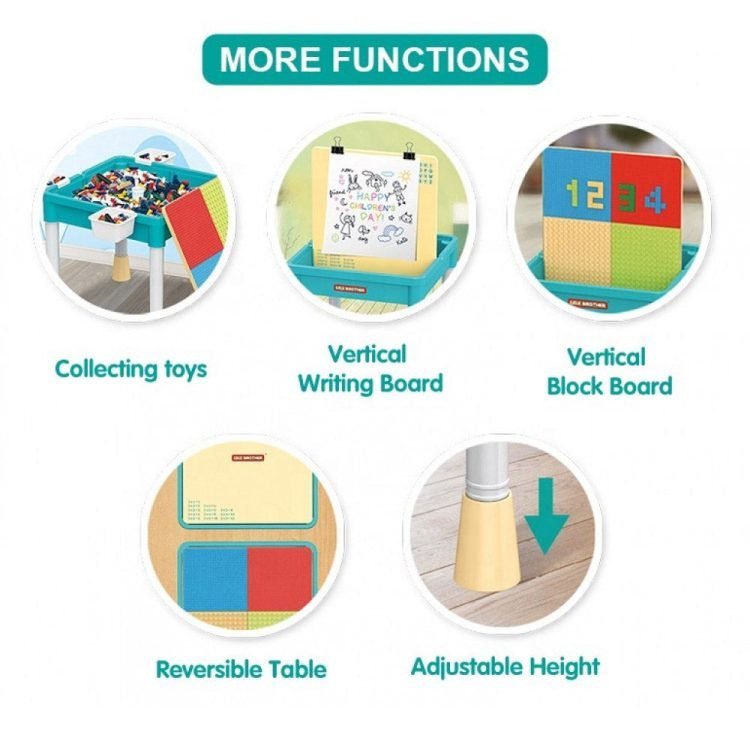 - Reversible Tabletop: The tabletop can be easily flipped, offering two distinctive surfaces for play and learning. One side caters to block enthusiasts, while the other side encourages kids to engage in a variety of activities, from drawing to crafting.