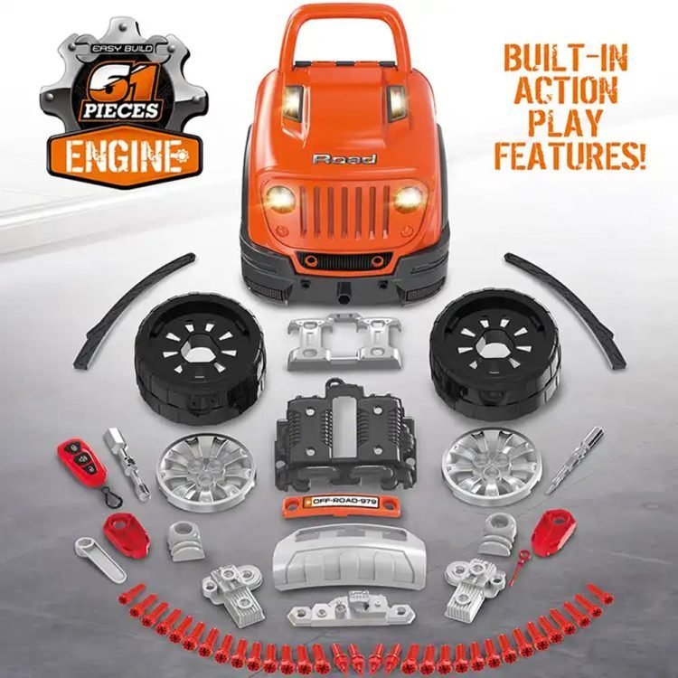 Watch as young minds explore the intricacies of an off-road vehicle, disassembling and reassembling parts with infrared remote control functionality, all while enjoying musical tunes and vibrant lights.