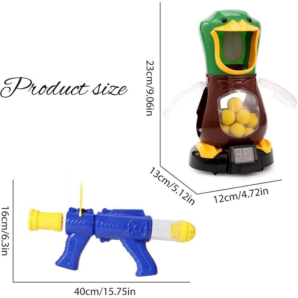 - [Super Value] Shooting Game Kit – EVA foam ball x24, air pump gun x2. Duck target with LCD scoreboard x1, Shooting target need place 2*1.5V AA batteries(Not included). Easy to use, a good toy for family and children to interact. Enjoy family leisure time and find more funny moment with family.