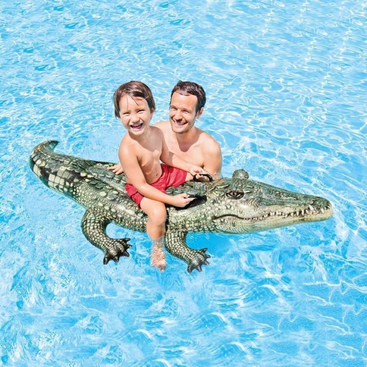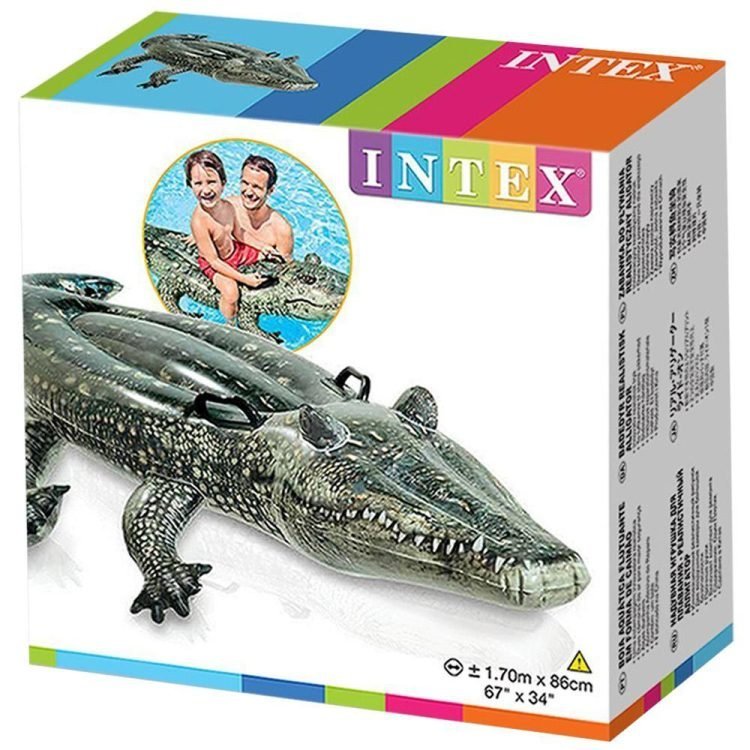 Bring a little colorful, realistic, friendly gator fun to your next pool or lake adventure with this delightful Realistic Gator Ride-On inflatable from Intex. The fun gator is made of a UV-resistant vinyl. Features room for multiple little riders and constructed of durable, 10-gauge vinyl with two heavy duty handles for extra stability. Includes repair patch kit.