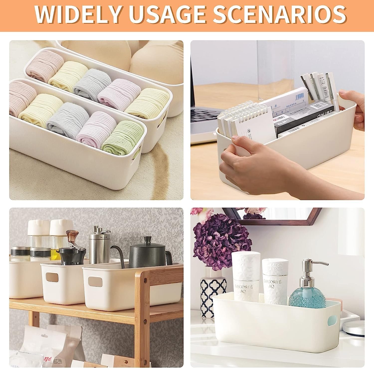 - Portable Design The plastic storage baskets have handles on both sides and are smoothed so as not to hurt your hands, allowing you to pick them up effortlessly. Our baskets are stackable so you can stack them compactly when not in use.