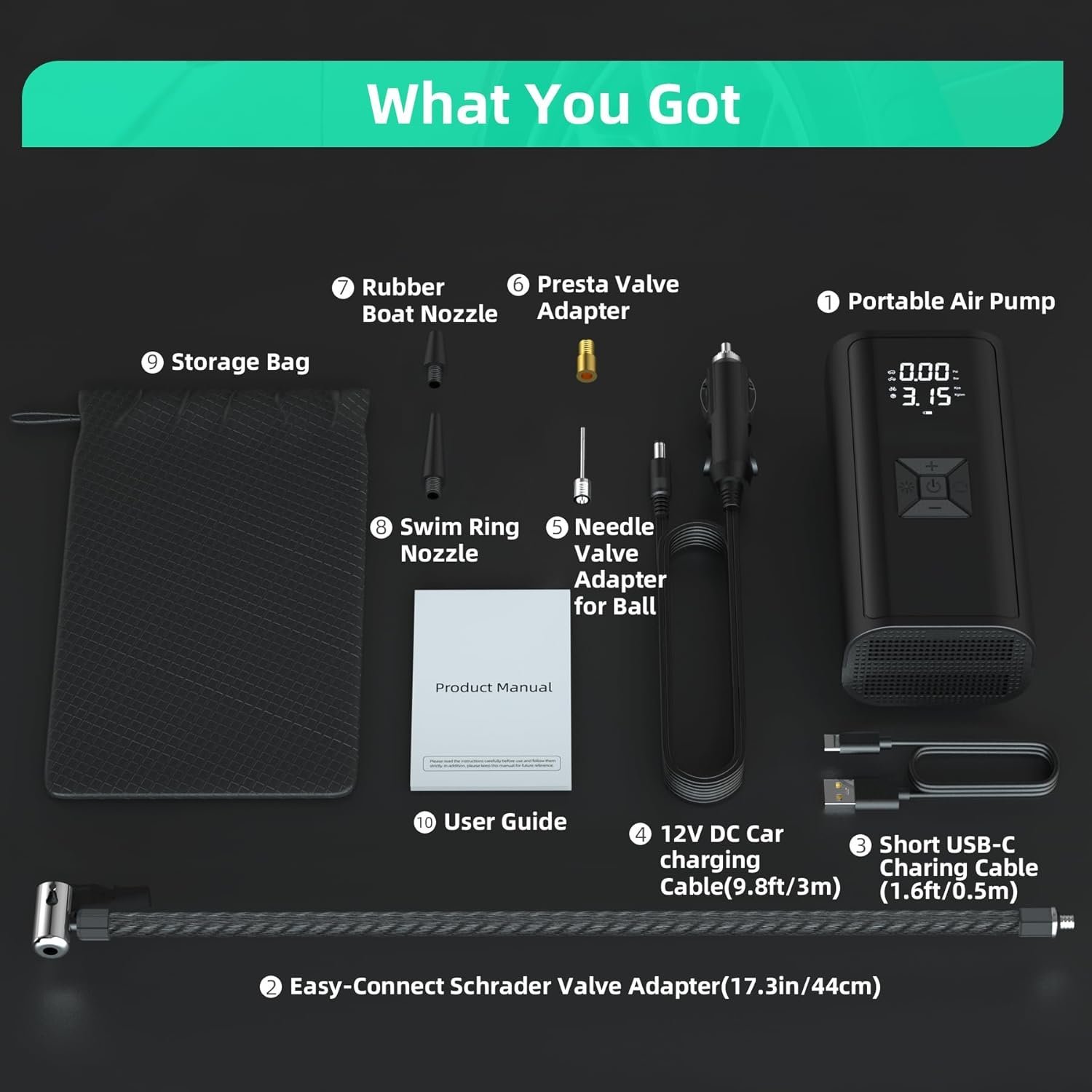 Package:1*portbale air pump, 1*quick connect hose(17.32), 4*adapters, 1*type-C cable(19.6in), 1*car charging cable(9.8ft) and a user manual, a storage bag.