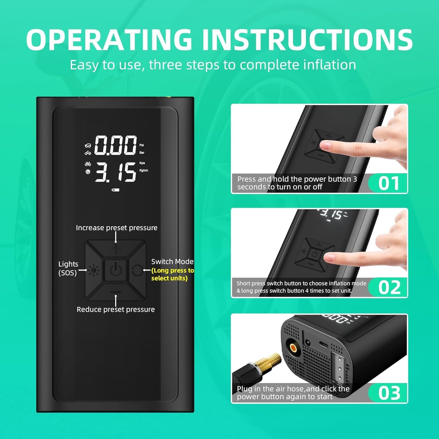 Portable Air Compressor – 4 preset inflation modes for inflating bicycles, motorbikes, cars and balls, automatically stops when the preset value is reached, easy to use for beginners. The manual mode allows you to set the pressure value up to 150PSI depending on the object to be inflated, easy to operate and meets a wide range of inflation needs.