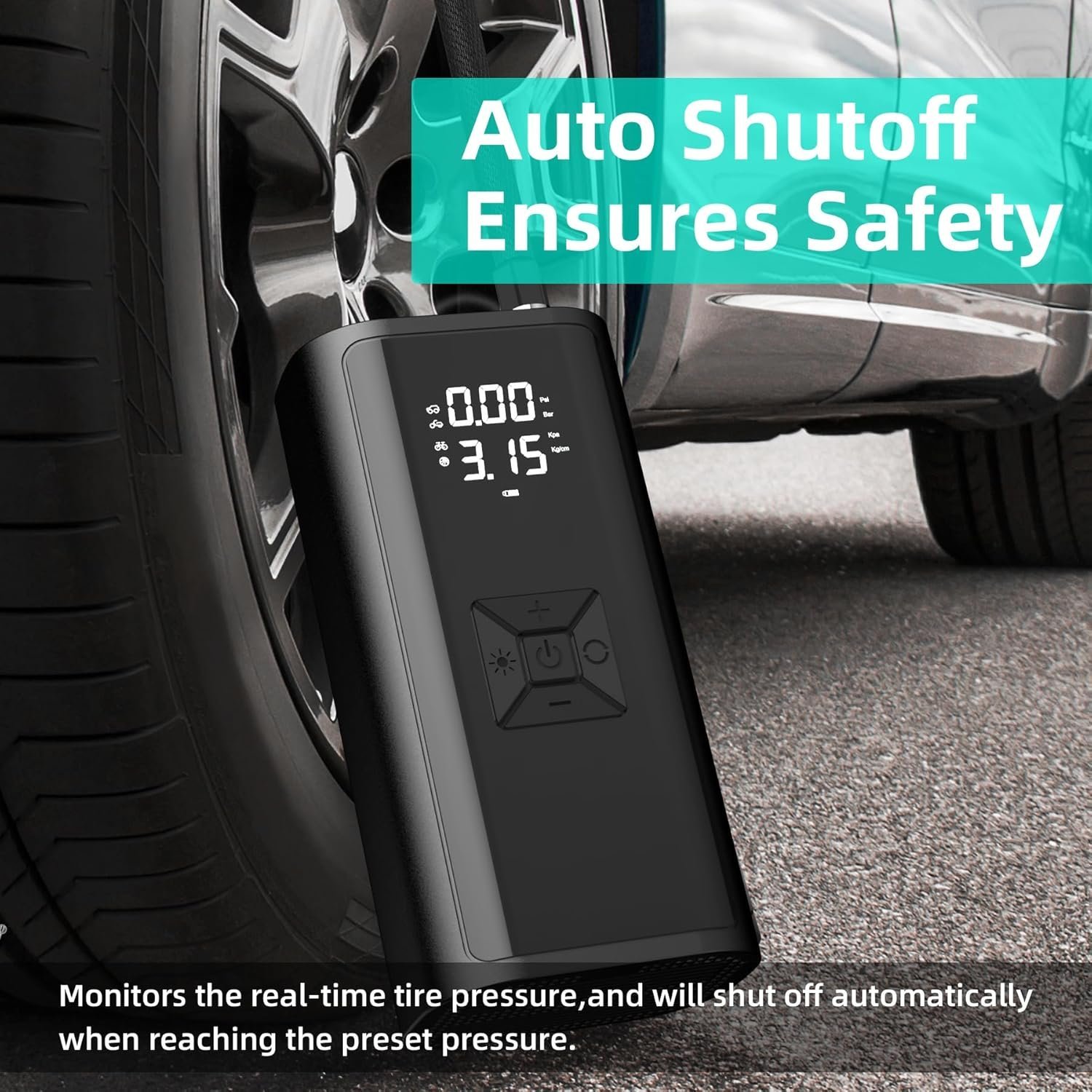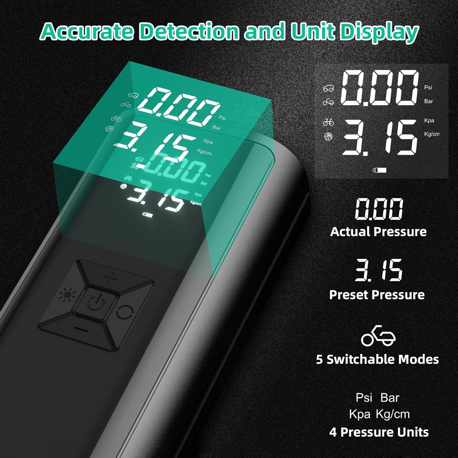 • [Digital Display Pump with Intelligent Control] The Double LCD digital screen first line will display the current pressure value when the tire pump is connected, second line display the preset value. The smart air pump has 4 optional units including PSI, BAR, KPA, Kg/cm². With auto shut-off function, the tire inflator will pump to the exact tire air pressure and stop inflating automatically once the tire pressure reaches the preset value.