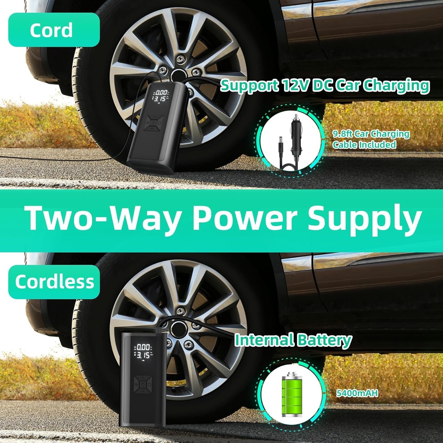 • [Dual Power Supply for Various Situation] The portable air pump quipped with a rechargeable upgrade 5400mAh battery, which makes you can enjoy the cordless air pump anytime. It also comes with 9.8 feet 12dc car charging cable, if you forget to charge the air compressor, then just connect the power cable and inflate immediately without waitting.