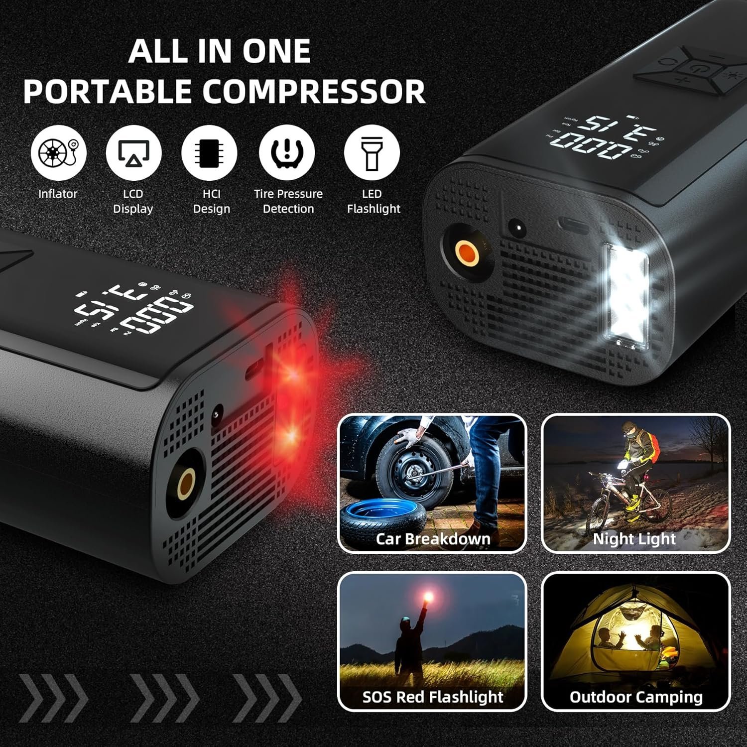 • [More Than A Tire Inflator] The portable size is easy to carry and can easily fit in your car or backpack. The brightness LED light(white&red) at the top of the tire inflator provides you with the convenience of emergency lighting like car breakdown, night light, SOS flashlight..️[Smart&Safe Air Pump] The rechargeable tire air pump is made to be a powerful solution for your daily pumping needs with the design of heat emission holes and auto-stop so as to prevent overheat&over-inlaftor.