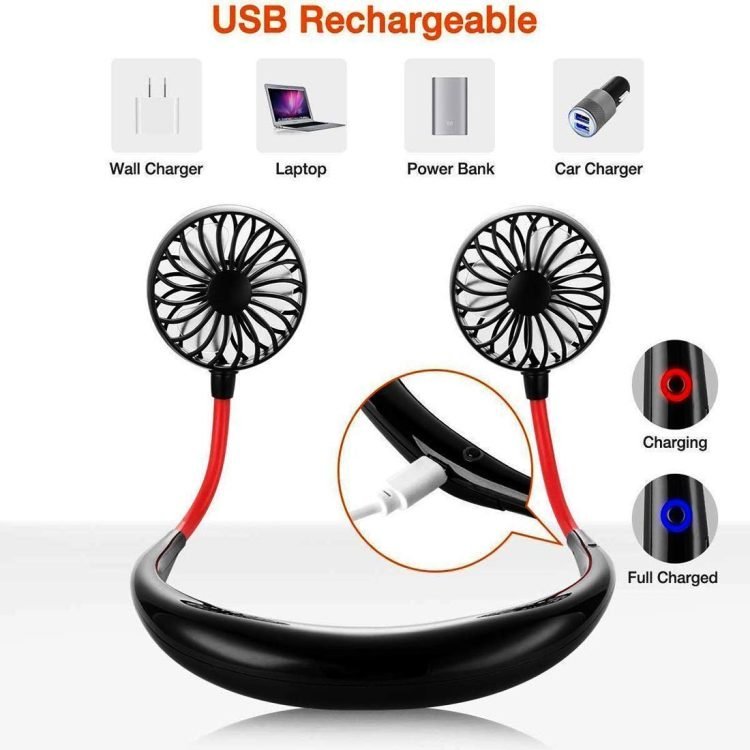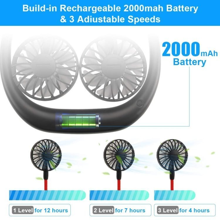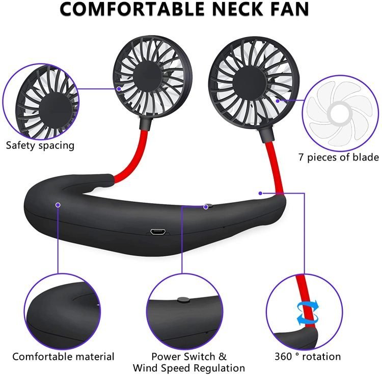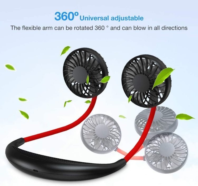 - 360? free rotation ? The ultra-quiet powerful neck fan features double heads design, and two heads can 360? flexible rotate, which allow you to adjust the best wind direction to cover your face, neck, shoulders, and chest. Perfect for indoor, outdoor, or travel use.