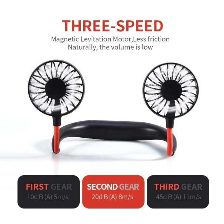 - 3 Adjustable Speeds- This Wearable Neckband USB Fan is available with Low / Medium / High speed levels according to your individual needs. Adjust appropriate fan speed by pressing the power button. Say goodbye to hot flashes, sweating, and flushing.